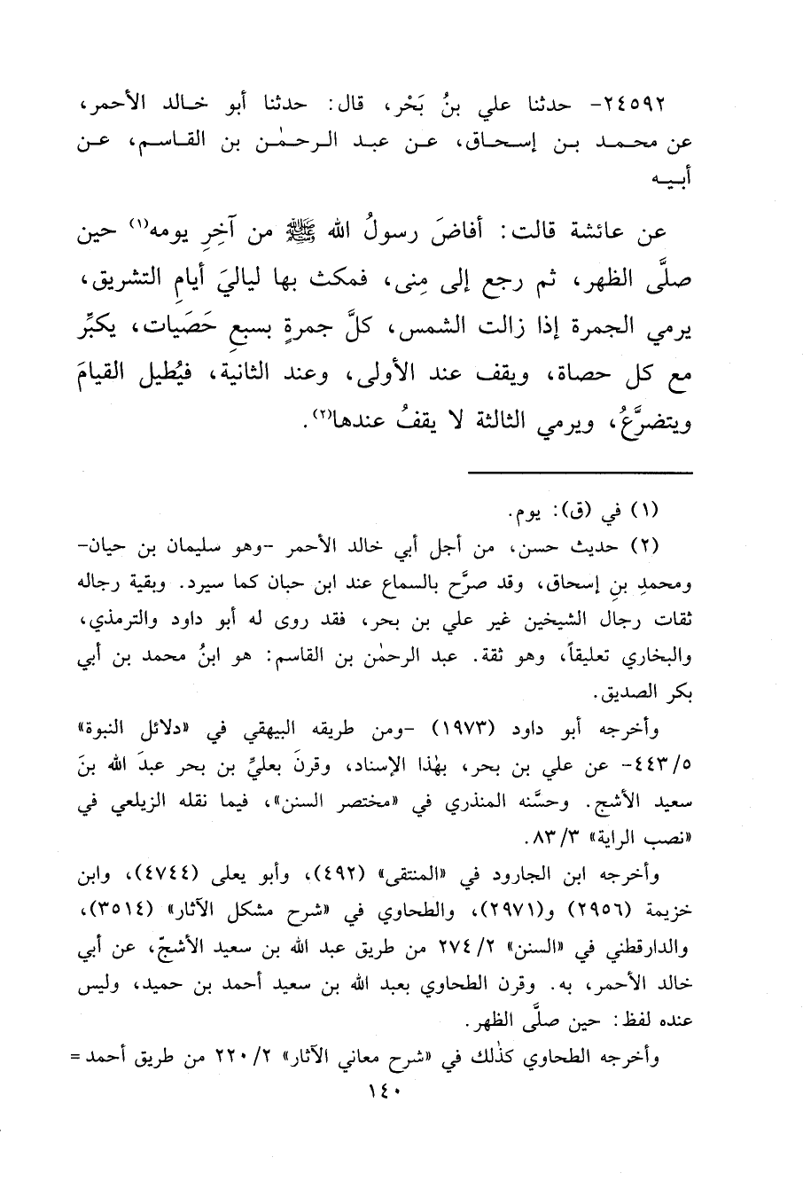 ٢٤٥٩٢ - حَدَّثَنَا عَلِيُّ بْنُ بَحْرٍ، قَالَ: حَدَّثَنَا أَبُو خَالِدٍ الْأَحْمَرُ، عَنْ مُحَمَّدِ بْنِ إِسْحَاقَ، عَنْ عَبْدِ الرَّحْمَنِ بْنِ الْقَاسِمِ، عَنْ أَبِيهِ، عَنْ عَائِشَةَ، قَالَتْ: " أَفَاضَ رَسُولُ اللهِ صَلَّى اللهُ عَلَيْهِ وَسَلَّمَ مِنْ آخِرِ يَوْمِهِ (١) حِينَ صَلَّى الظُّهْرَ، ثُمَّ رَجَعَ إِلَى مِنًى، فَمَكَثَ بِهَا لَيَالِيَ أَيَّامِ التَّشْرِيقِ، يَرْمِي الْجَمْرَةَ إِذَا زَالَتِ الشَّمْسُ، كُلُّ جَمْرَةٍ بِسَبْعِ حَصَيَاتٍ، يُكَبِّرُ مَعَ كُلِّ حَصَاةٍ، وَيَقِفُ عِنْدَ الْأُولَى، وَعِنْدَ الثَّانِيَةِ، فَيُطِيلُ الْقِيَامَ وَيَتَضَرَّعُ، وَيَرْمِي الثَّالِثَةَ لَا يَقِفُ عِنْدَهَا " (٢)