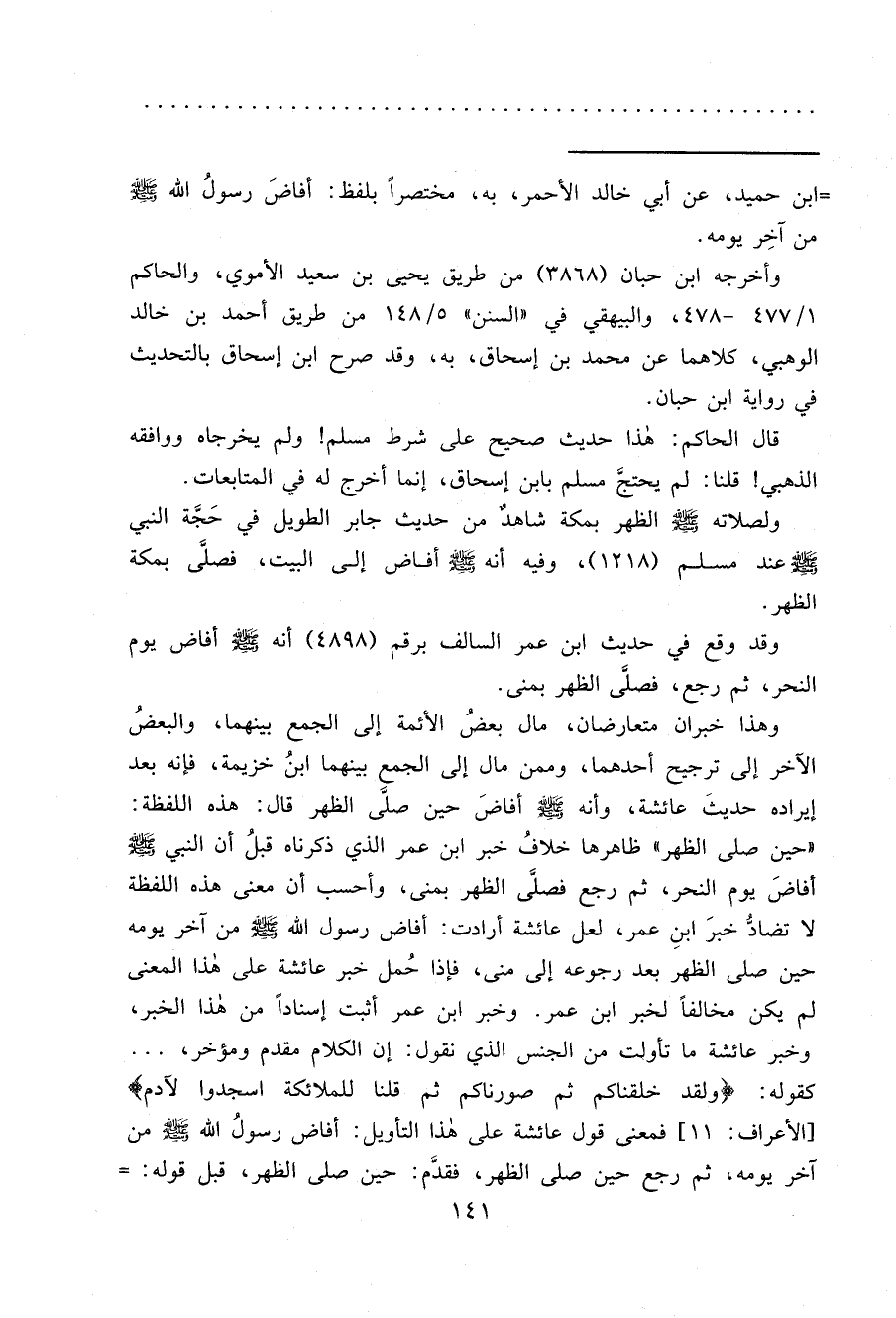 لم يكن مخالفاً لخبر ابن عمر. وخبر ابن عمر أثبت إسناداً من هذا الخبر، وخبر عائشة ما تأولت من الجنس الذي نقول: إن الكلام مقدم ومؤخر، ... كقوله: {وَلَقَدْ خَلَقْنَاكُمْ ثُمَّ صَوَّرْنَاكُمْ ثُمَّ قُلْنَا لِلْمَلَائِكَةِ اسْجُدُوا لِآدَمَ} [الأعراف: ١١] فمعنى قول عائشة على هذا التأويل: أفاض رسولُ الله صَلَّى اللهُ عَلَيْهِ وَسَلَّمَ من آخر يومه، ثم رجع حين صلى الظهر، فقدَّم: حين صلى الظهر، قبل قوله:=