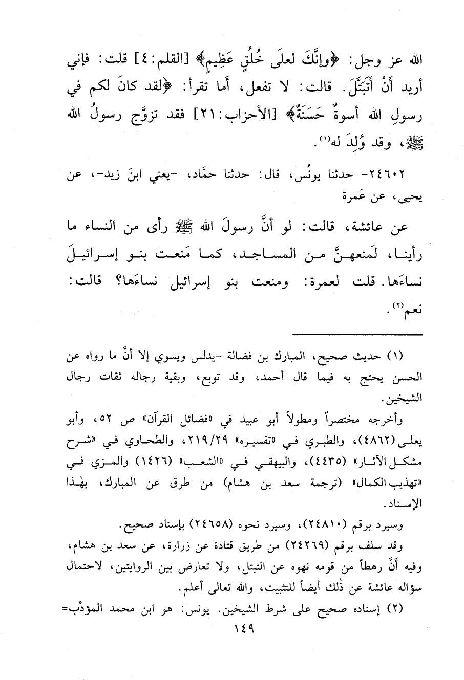 ٢٤٦٠٢ - حَدَّثَنَا يُونُسُ، قَالَ: حَدَّثَنَا حَمَّادٌ يَعْنِي ابْنَ زَيْدٍ، عَنْ يَحْيَى، عَنْ عَمْرَةَ، عَنْ عَائِشَةَ، قَالَتْ: " لَوْ أَنَّ رَسُولَ اللهِ صَلَّى اللهُ عَلَيْهِ وَسَلَّمَ رَأَى مِنَ النِّسَاءِ مَا رَأَيْنَا، لَمَنَعَهُنَّ مِنَ الْمَسَاجِدِ، كَمَا مَنَعَتْ بَنُو إِسْرَائِيلَ نِسَاءَهَا "، قُلْتْ لِعَمْرَةَ: وَمَنَعَتْ بَنُو إِسْرَائِيلَ نِسَاءَهَا؟ قَالَتْ: " نَعَمْ " (٢)
