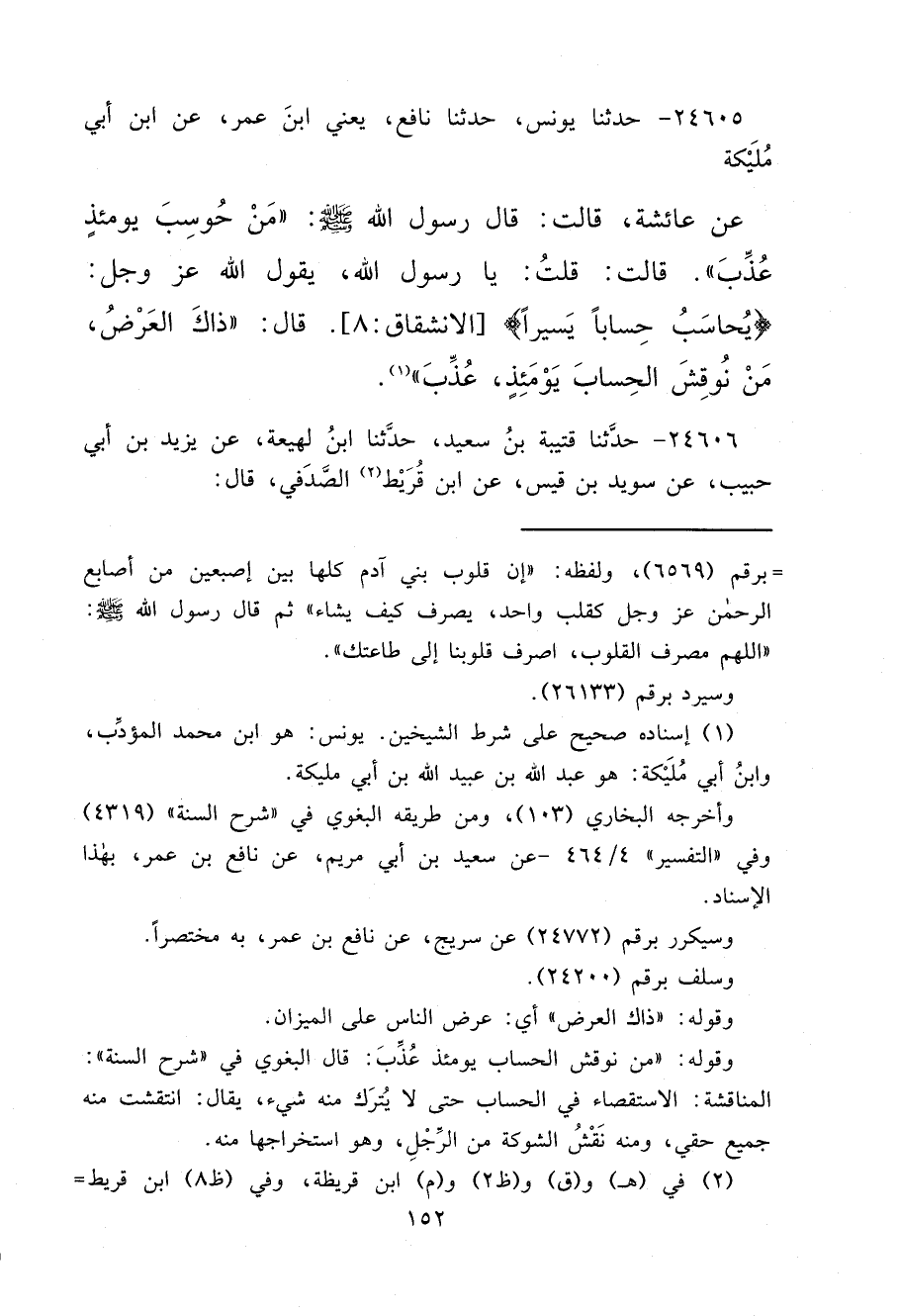 ٢٤٦٠٥ - حَدَّثَنَا يُونُسُ، حَدَّثَنَا نَافِعٌ يَعْنِي ابْنَ عُمَرَ، عَنْ ابْنِ أَبِي مُلَيْكَةَ، عَنْ عَائِشَةَ، قَالَتْ: قَالَ رَسُولُ اللهِ صَلَّى اللهُ عَلَيْهِ وَسَلَّمَ: " مَنْ حُوسِبَ يَوْمَئِذٍ عُذِّبَ "، قَالَتْ: قُلْتُ: يَا رَسُولَ اللهِ، يَقُولُ اللهُ عَزَّ وَجَلَّ: {يُحَاسَبُ حِسَابًا يَسِيرًا} [الانشقاق: ٨] ، قَالَ: " ذَاكَ الْعَرْضُ، مَنْ نُوقِشَ الْحِسَابَ يَوْمَئِذٍ، عُذِّبَ " (١)