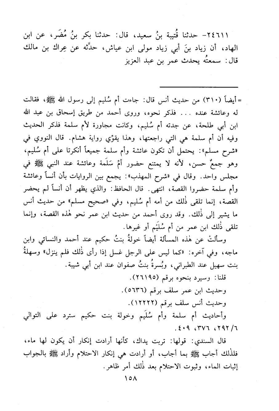 وأحاديث أم سلمة وأم سُلَيم وخولة بنت حكيم سترد على التوالي ٦ / ٢٩٢، ٣٧٦، ٤٠٩.