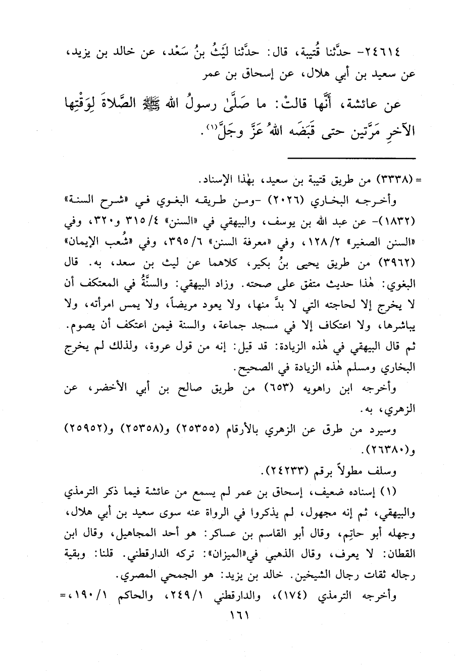 ٢٤٦١٤ - حَدَّثَنَا قُتَيْبَةُ، قَالَ: حَدَّثَنَا لَيْثُ بْنُ سَعْدٍ، عَنْ خَالِدِ بْنِ يَزِيدَ، عَنْ سَعِيدِ بْنِ أَبِي هِلَالٍ، عَنْ إِسْحَاقَ بْنِ عُمَرَ، عَنْ عَائِشَةَ، أَنَّهَا قَالَتْ: " مَا صَلَّى رَسُولُ اللهِ صَلَّى اللهُ عَلَيْهِ وَسَلَّمَ الصَّلَاةَ لِوَقْتِهَا الْآخَرِ مَرَّتَيْنِ حَتَّى قَبَضَهُ اللهُ عَزَّ وَجَلَّ " (١)