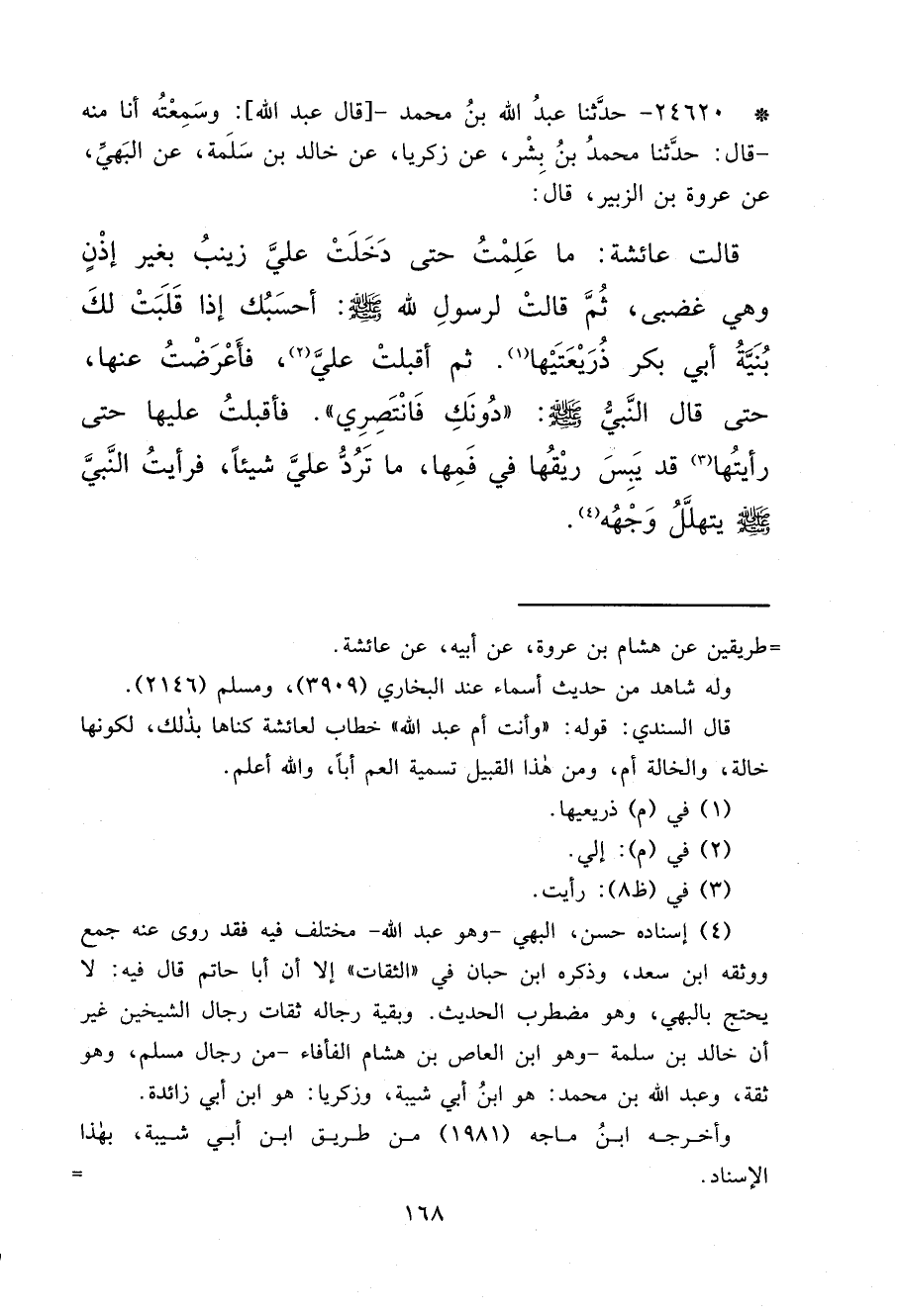 * ٢٤٦٢٠ - حَدَّثَنَا عَبْدُ اللهِ بْنُ مُحَمَّدٍ، قَالَ عَبْد اللهِ: وَسَمِعْتُهُ أَنَا مِنْهُ، قَالَ: حَدَّثَنَا مُحَمَّدُ بْنُ بِشْرٍ، عَنْ زَكَرِيَّا، عَنْ خَالِدِ بْنِ سَلَمَةَ، عَنْ الْبَهِيِّ، عَنْ عُرْوَةَ بْنِ الزُّبَيْرِ، قَالَ: قَالَتْ عَائِشَةُ: مَا عَلِمْتُ حَتَّى دَخَلَتْ عَلَيَّ زَيْنَبُ بِغَيْرِ إِذْنٍ وَهِيَ غَضْبَى، ثُمَّ قَالَتْ لِرَسُولِ اللهِ صَلَّى اللهُ عَلَيْهِ وَسَلَّمَ: أَحْسِبُكَ إِذَا قَلَبَتْ لَكَ بُنَيَّةُ أَبِي بَكْرٍ ذُرَيِّعَتَيْهَا (١) ، ثُمَّ أَقْبَلَتْ عَلَيَّ (٢) ، فَأَعْرَضْتُ عَنْهَا، حَتَّى قَالَ النَّبِيُّ صَلَّى اللهُ عَلَيْهِ وَسَلَّمَ: " دُونَكِ فَانْتَصِرِي "، فَأَقْبَلْتُ عَلَيْهَا حَتَّى رَأَيْتُهَا (٣) قَدْ يَبِسَ رِيقُهَا فِي فَمِهَا، مَا تَرُدُّ عَلَيَّ شَيْئًا، فَرَأَيْتُ النَّبِيَّ صَلَّى اللهُ عَلَيْهِ وَسَلَّمَ يَتَهَلَّلُ وَجْهُهُ (٤)