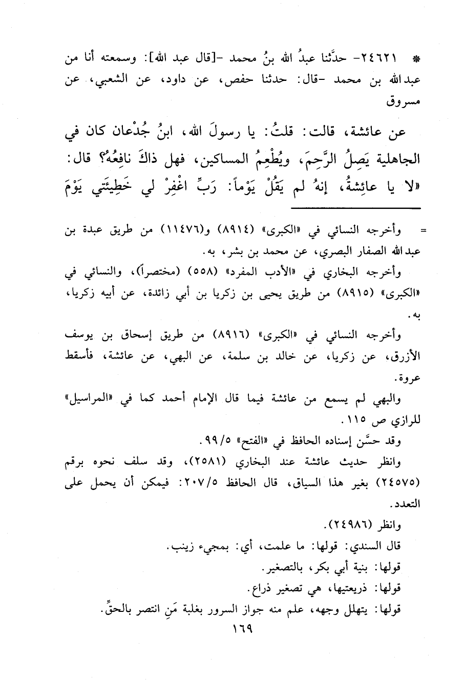 * ٢٤٦٢١ - حَدَّثَنَا عَبْدُ اللهِ بْنُ مُحَمَّدٍ، قَالَ عَبْد اللهِ: وَسَمِعْتُهُ أَنَا مِنْ عَبْدِ اللهِ بْنِ مُحَمَّدٍ، قَالَ: حَدَّثَنَا حَفْصٌ، عَنْ دَاوُدَ، عَنْ الشَّعْبِيِّ، عَنْ مَسْرُوقٍ، عَنْ عَائِشَةَ، قَالَتْ: قُلْتُ: يَا رَسُولَ اللهِ، ابْنُ جُدْعَانَ كَانَ فِي الْجَاهِلِيَّةِ يَصِلُ الرَّحِمَ، وَيُطْعِمُ الْمَسَاكِينَ، فَهَلْ ذَاكَ نَافِعُهُ؟ قَالَ: " لَا يَا عَائِشَةُ، إِنَّهُ لَمْ يَقُلْ يَوْمًا: رَبِّ اغْفِرْ لِي خَطِيئَتِي يَوْمَ