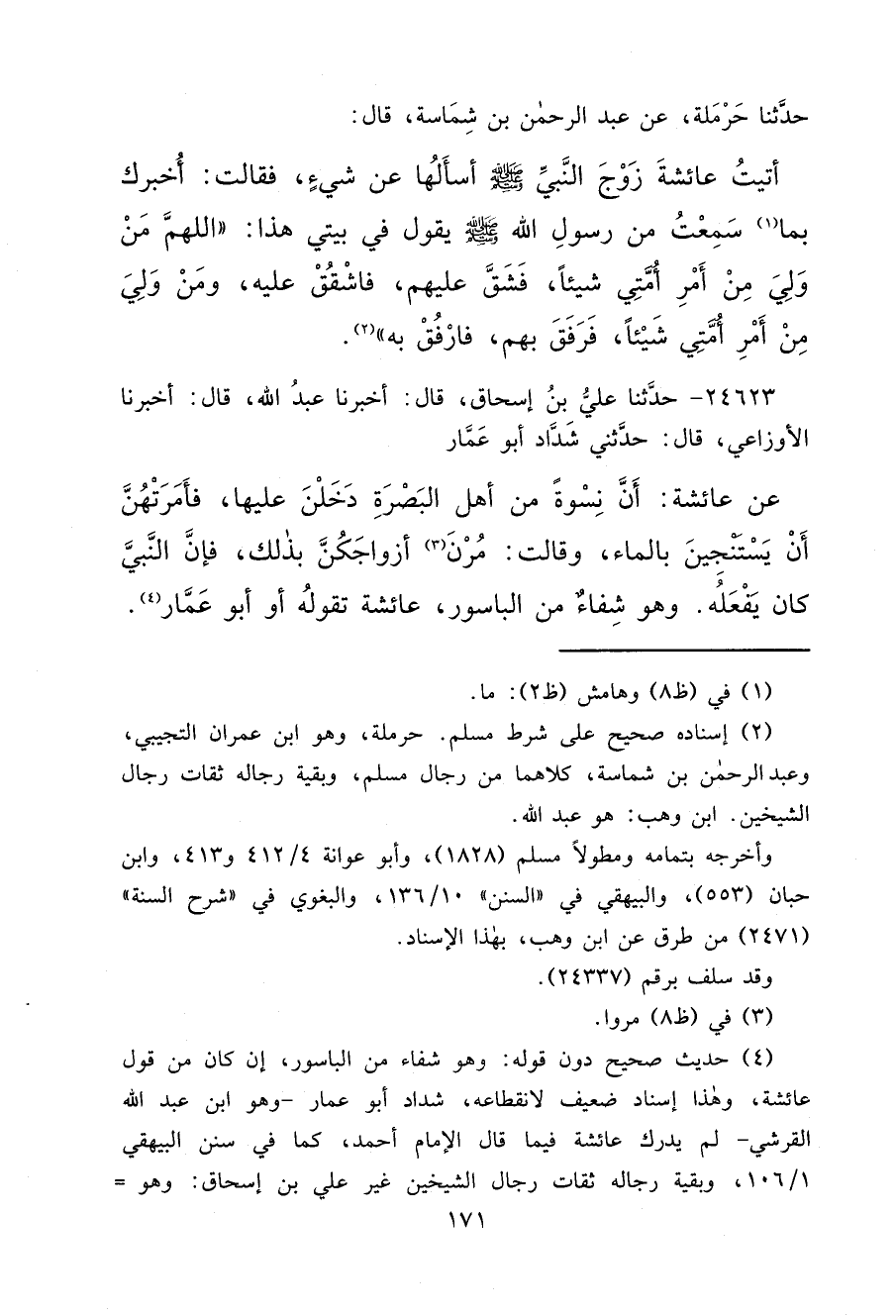 حَدَّثَنَا حَرْمَلَةُ، عَنْ عَبْدِ الرَّحْمَنِ بْنِ شِمَاسَةَ، قَالَ: أَتَيْتُ عَائِشَةَ زَوْجَ النَّبِيِّ صَلَّى اللهُ عَلَيْهِ وَسَلَّمَ، أَسْأَلُهَا عَنْ شَيْءٍ، فَقَالَتْ: أُخْبِرُكَ بِمَا (١) سَمِعْتُ مِنْ رَسُولِ اللهِ صَلَّى اللهُ عَلَيْهِ وَسَلَّمَ يَقُولُ فِي بَيْتِي هَذَا: " اللهُمَّ مَنْ وَلِيَ مِنْ أَمْرِ أُمَّتِي شَيْئًا، فَشَقَّ عَلَيْهِمْ، فَاشْقُقْ عَلَيْهِ، وَمَنْ وَلِيَ مِنْ أَمْرِ أُمَّتِي شَيْئًا، فَرَفَقَ بِهِمْ، فَارْفُقْ بِهِ " (٢)