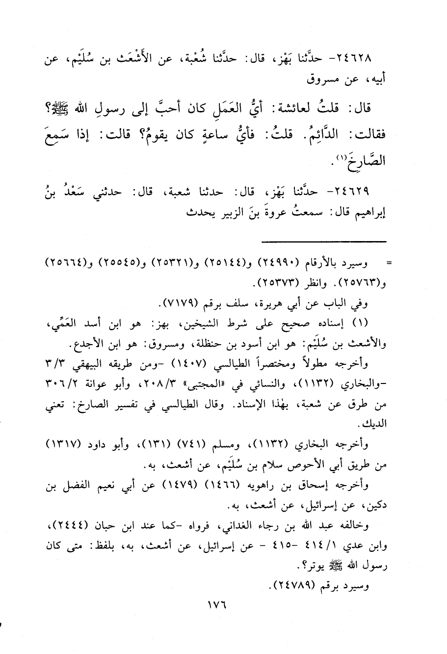 ٢٤٦٢٨ - حَدَّثَنَا بَهْزٌ، قَالَ: حَدَّثَنَا شُعْبَةُ، عَنْ الْأَشْعَثِ بْنِ سُلَيْمٍ، عَنْ أَبِيهِ، عَنْ مَسْرُوقٍ، قَالَ: قُلْتُ لِعَائِشَةَ: أَيُّ الْعَمَلِ كَانَ أَحَبَّ إِلَى رَسُولِ اللهِ صَلَّى اللهُ عَلَيْهِ وَسَلَّمَ؟ فَقَالَتْ: " الدَّائِمُ "، قُلْتُ: فَأَيُّ سَاعَةٍ كَانَ يَقُومُ؟ قَالَتْ: " إِذَا سَمِعَ الصَّارِخَ " (١)