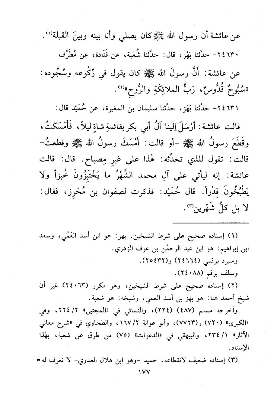 ٢٤٦٣٠ - حَدَّثَنَا بَهْزٌ، قَالَ: حَدَّثَنَا شُعْبَةُ، عَنْ قَتَادَةَ، عَنْ مُطَرِّفٍ، عَنْ عَائِشَةَ، أَنَّ رَسُولَ اللهِ صَلَّى اللهُ عَلَيْهِ وَسَلَّمَ كَانَ يَقُولُ فِي رُكُوعِهِ وَسُجُودِهِ: " سُبُّوحٌ قُدُّوسٌ، رَبُّ الْمَلَائِكَةِ وَالرُّوحِ " (٢)