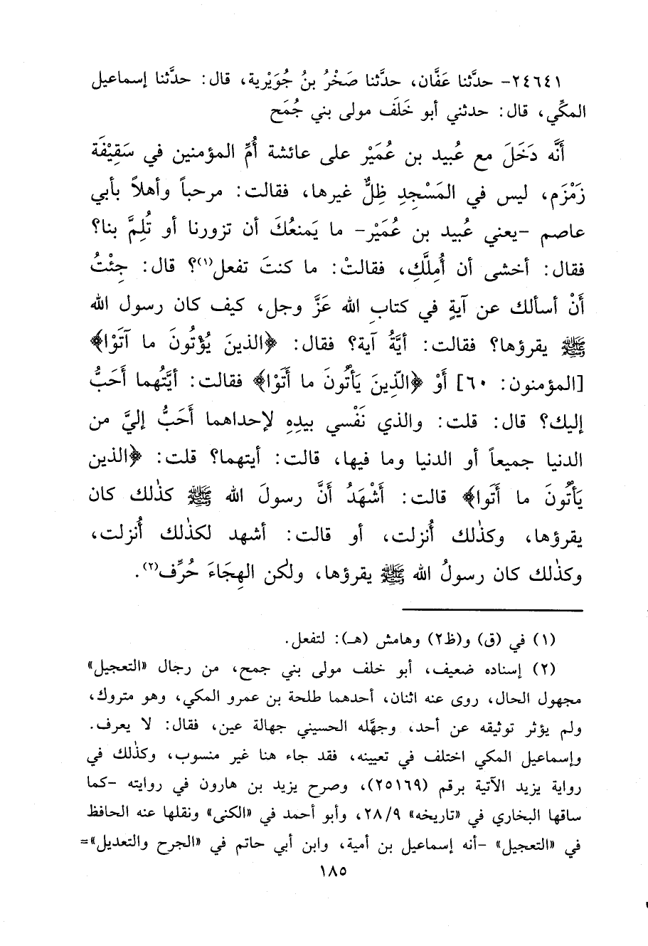 ٢٤٦٤١ - حَدَّثَنَا عَفَّانُ، حَدَّثَنَا صَخْرُ بْنُ جُوَيْرِيَةَ، قَالَ: حَدَّثَنَا إِسْمَاعِيلُ الْمَكِّيُّ، قَالَ: حَدَّثَنِي أَبُو خَلَفٍ مَوْلَى بَنِي جُمَحٍ، أَنَّهُ دَخَلَ مَعَ عُبَيْدِ بْنِ عُمَيْرٍ عَلَى عَائِشَةَ أُمِّ الْمُؤْمِنِينَ فِي سَقِيفَةِ زَمْزَمَ، لَيْسَ فِي الْمَسْجِدِ ظِلٌّ غَيْرَهَا، فَقَالَتْ: مَرْحَبًا، وَأَهْلًا بِأَبِي عَاصِمٍ يَعْنِي عُبَيْدَ بْنَ عُمَيْرٍ، مَا يَمْنَعُكَ أَنْ تَزُورَنَا، أَوْ تُلِمَّ بِنَا؟ فَقَالَ: أَخْشَى أَنْ أُمِلَّكِ، فَقَالَتْ: مَا كُنْتَ تَفْعَلُ (١) ، قَالَ: جِئْتُ أَنْ أَسْأَلَكِ عَنْ آيَةٍ فِي كِتَابِ اللهِ عَزَّ وَجَلَّ، كَيْفَ كَانَ رَسُولُ اللهِ صَلَّى اللهُ عَلَيْهِ وَسَلَّمَ يَقْرَؤُهَا؟ فَقَالَتْ: أَيَّةُ آيَةٍ؟ فَقَالَ: " الَّذِينَ يُؤْتُونَ مَا آَتَوْا "، أَوْ " الَّذِينَ يَأْتُونَ مَا أَتَوْا "، فَقَالَتْ: أَيَّتُهُمَا أَحَبُّ إِلَيْكَ؟ قَالَ: قُلْتُ: وَالَّذِي نَفْسِي بِيَدِهِ، لَإِحْدَاهُمَا أَحَبُّ إِلَيَّ مِنَ الدُّنْيَا جَمِيعًا، أَوِ الدُّنْيَا وَمَا فِيهَا، قَالَتْ: أَيَّتُهُمَا؟ قُلْتُ: " الَّذِينَ يَأْتُونَ مَا أَتَوْا "، قَالَتْ: " أَشْهَدُ أَنَّ رَسُولَ اللهِ صَلَّى اللهُ عَلَيْهِ وَسَلَّمَ كَذَلِكَ كَانَ يَقْرَؤُهَا، وَكَذَلِكَ أُنْزِلَتْ، أَوْ قَالَتْ: أَشْهَدُ لَكَذَلِكَ أُنْزِلَتْ، وَكَذَلِكَ كَانَ رَسُولُ اللهِ صَلَّى اللهُ عَلَيْهِ وَسَلَّمَ يَقْرَؤُهَا، وَلَكِنَّ الْهِجَاءَ حَرْفٌ " (٢)