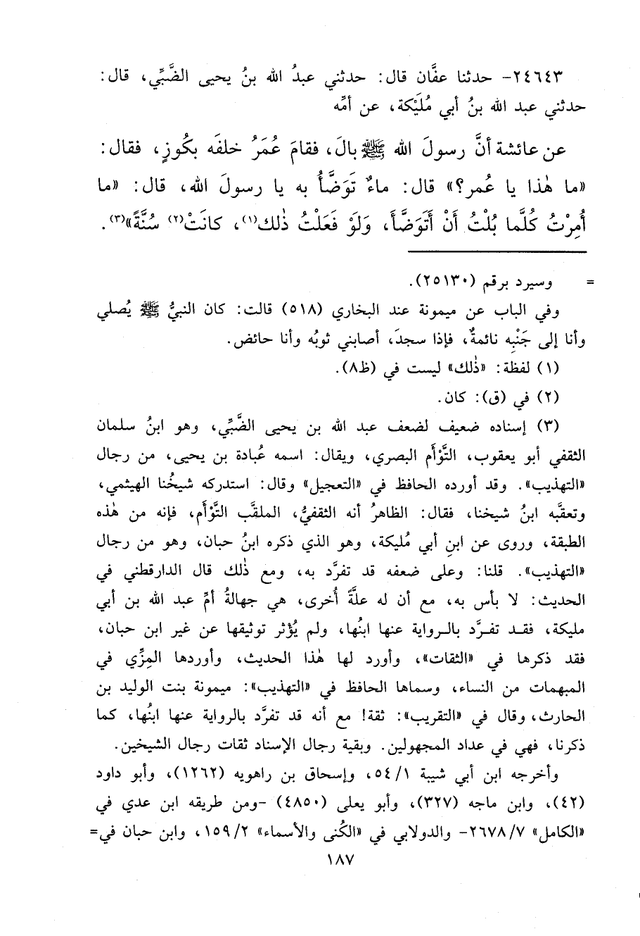 ٢٤٦٤٣ - حَدَّثَنَا عَفَّانُ، قَالَ: حَدَّثَنِي عَبْدُ اللهِ بْنُ يَحْيَى الضَّبِّيُّ، قَالَ: حَدَّثَنِي عَبْدُ اللهِ بْنُ أَبِي مُلَيْكَةَ، عَنْ أُمِّهِ، عَنْ عَائِشَةَ، أَنَّ رَسُولَ اللهِ صَلَّى اللهُ عَلَيْهِ وَسَلَّمَ بَالَ، فَقَامَ عُمَرُ خَلْفَهُ بِكُوزٍ، فَقَالَ: " مَا هَذَا يَا عُمَرُ؟ " قَالَ: مَاءٌ تَوَضَّأْ بِهِ يَا رَسُولَ اللهِ، قَالَ: " مَا أُمِرْتُ كُلَّمَا بُلْتُ أَنْ أَتَوَضَّأَ، وَلَوْ فَعَلْتُ ذَلِكَ (١) كَانَتْ (٢) سُنَّةً " (٣)