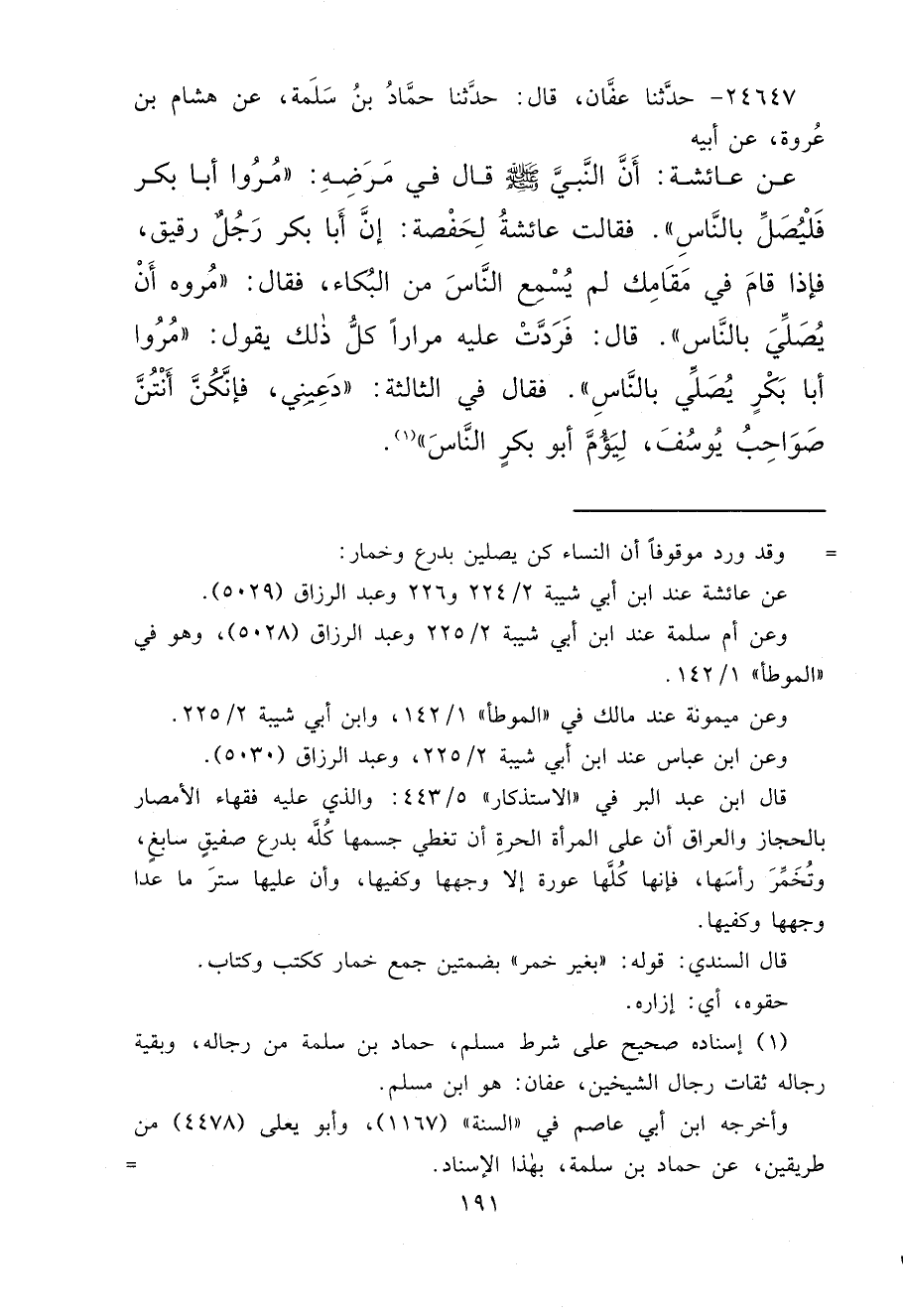 ٢٤٦٤٧ - حَدَّثَنَا عَفَّانُ، قَالَ: حَدَّثَنَا حَمَّادُ بْنُ سَلَمَةَ، عَنْ هِشَامِ بْنِ عُرْوَةَ، عَنْ أَبِيهِ، عَنْ عَائِشَةَ، أَنَّ النَّبِيَّ صَلَّى اللهُ عَلَيْهِ وَسَلَّمَ، قَالَ فِي مَرَضِهِ: " مُرُوا أَبَا بَكْرٍ، فَلْيُصَلِّ بِالنَّاسِ "، فَقَالَتْ عَائِشَةُ لِحَفْصَةَ: إِنَّ أَبَا بَكْرٍ رَجُلٌ رَقِيقٌ، فَإِذَا قَامَ فِي مَقَامِكَ لَمْ يُسْمِعِ النَّاسَ مِنَ الْبُكَاءِ، فَقَالَ: " مُرُوهُ أَنْ يُصَلِّيَ بِالنَّاسِ "، قَالَ: فَرَدَّتْ عَلَيْهِ مِرَارًا، كُلُّ ذَلِكَ يَقُولُ: " مُرُوا أَبَا بَكْرٍ يُصَلِّي بِالنَّاسِ "، فَقَالَ فِي الثَّالِثَةِ: " دَعِينِي، فَإِنَّكُنَّ أَنْتُنَّ صَوَاحِبُ يُوسُفَ، لِيَؤُمَّ أَبُو بَكْرٍ النَّاسَ " (١)