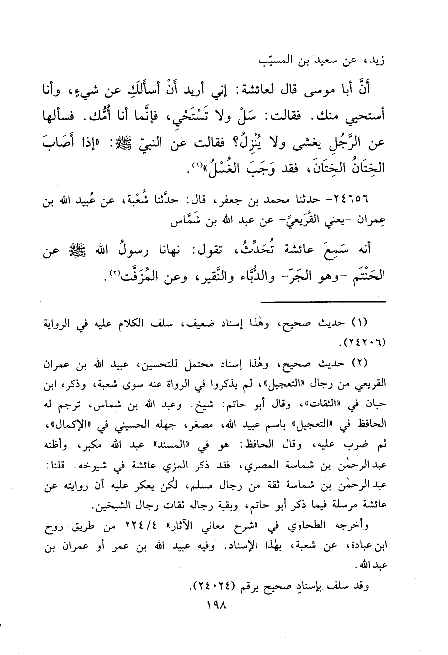 زَيْدٍ، عَنْ سَعِيدِ بْنِ الْمُسَيِّبِ، أَنَّ أَبَا مُوسَى، قَالَ لِعَائِشَةَ: إِنِّي أُرِيدُ أَنْ أَسْأَلَكِ عَنْ شَيْءٍ، وَأَنَا أَسْتَحْيِي مِنْكِ، فَقَالَتْ: " سَلْ، وَلَا تَسْتَحْيِ، فَإِنَّمَا أَنَا أُمُّكَ "، فَسَأَلَهَا عَنِ الرَّجُلِ يَغْشَى، وَلَا يُنْزِلُ، فَقَالَتْ عَنِ النَّبِيِّ صَلَّى اللهُ عَلَيْهِ وَسَلَّمَ: " إِذَا أَصَابَ الْخِتَانُ الْخِتَانَ، فَقَدْ وَجَبَ الْغُسْلُ " (١)
