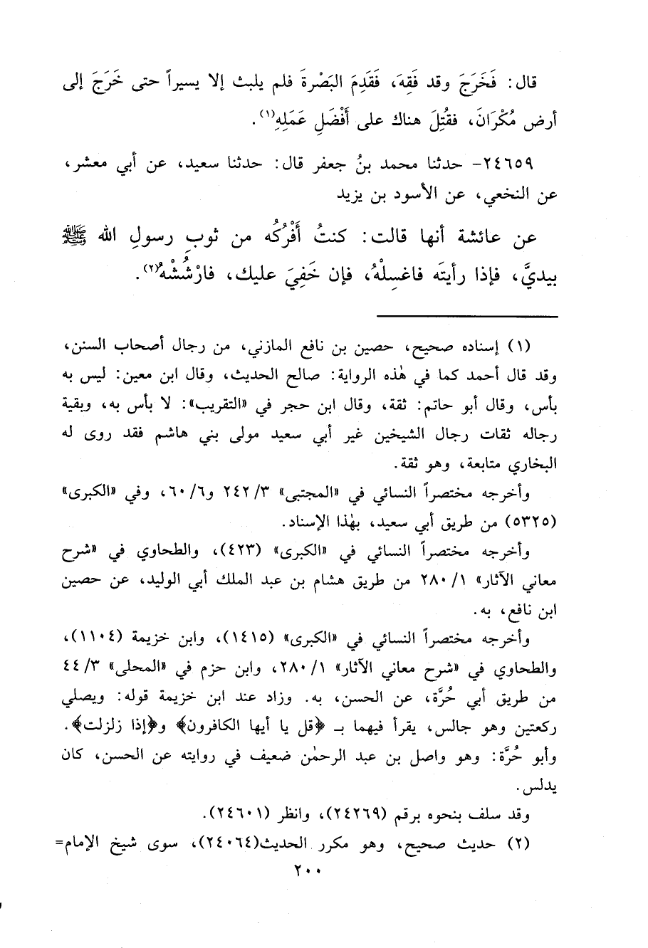 ٢٤٦٥٩ - حَدَّثَنَا مُحَمَّدُ بْنُ جَعْفَرٍ، قَالَ: حَدَّثَنَا سَعِيدٌ، عَنْ أَبِي مَعْشَرٍ، عَنْ النَّخَعِيِّ، عَنْ الْأَسْوَدِ بْنِ يَزِيدَ، عَنْ عَائِشَةَ، أَنَّهَا قَالَتْ: " كُنْتُ أَفْرُكُهُ مِنْ ثَوْبِ رَسُولِ اللهِ صَلَّى اللهُ عَلَيْهِ وَسَلَّمَ بِيَدِي، فَإِذَا رَأَيْتَهُ فَاغْسِلْهُ، فَإِنْ خَفِيَ عَلَيْكَ فَارْشُشْهُ " (٢)