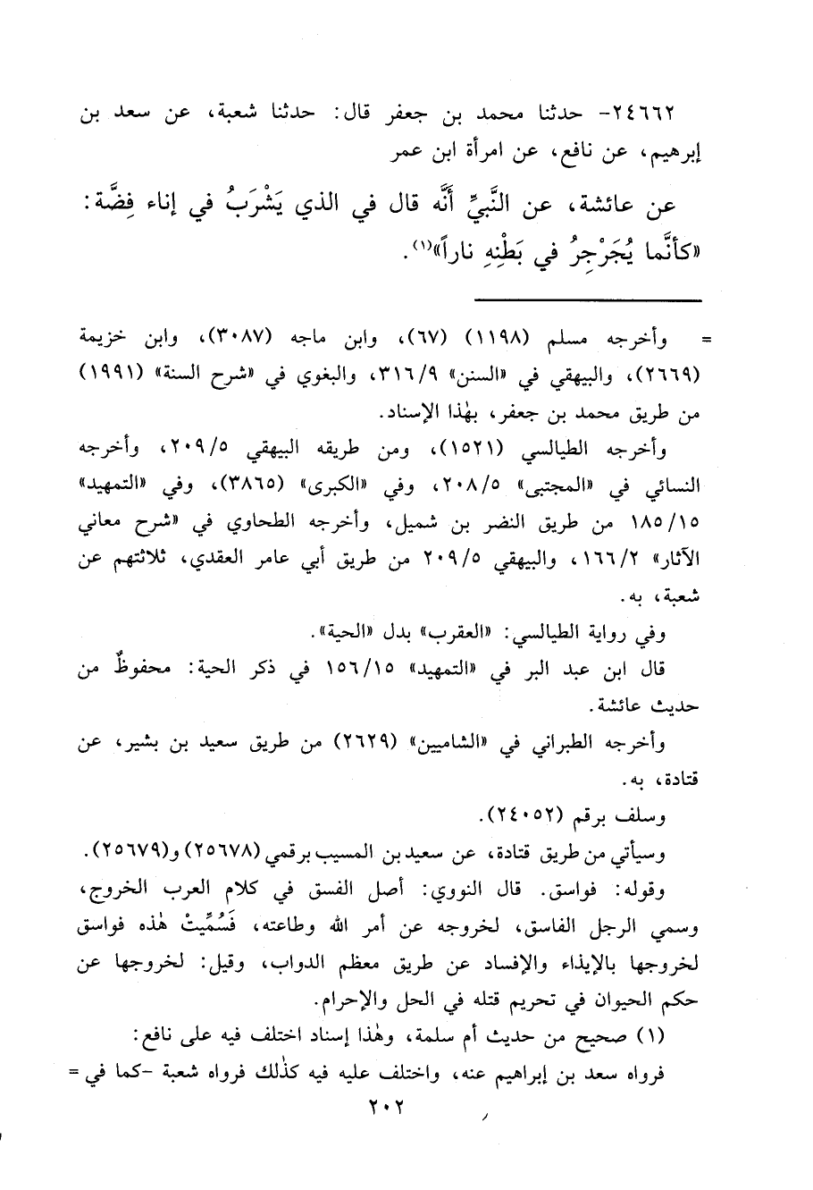 ٢٤٦٦٢ - حَدَّثَنَا مُحَمَّدُ بْنُ جَعْفَرٍ، قَالَ: حَدَّثَنَا شُعْبَةُ، عَنْ سَعْدِ بْنِ إِبْرَاهِيمَ، عَنْ نَافِعٍ، عَنْ امْرَأَةِ ابْنِ عُمَرَ، عَنْ عَائِشَةَ، عَنِ النَّبِيِّ أَنَّهُ قَالَ فِي الَّذِي يَشْرَبُ فِي إِنَاءِ فِضَّةٍ: " كَأَنَّمَا يُجَرْجِرُ فِي بَطْنِهِ نَارًا " (١)