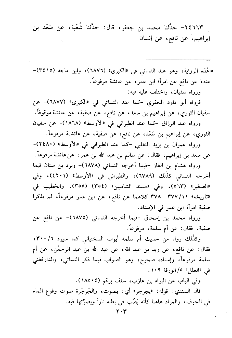 فرواه أبو داود الحفري -كما عند النسائي في "الكبرى" (٦٨٧٧) - عن سفيان الثوري، عن إبراهيم بن سعد، عن نافع، عن صفية، عن عائشة موقوفاً.