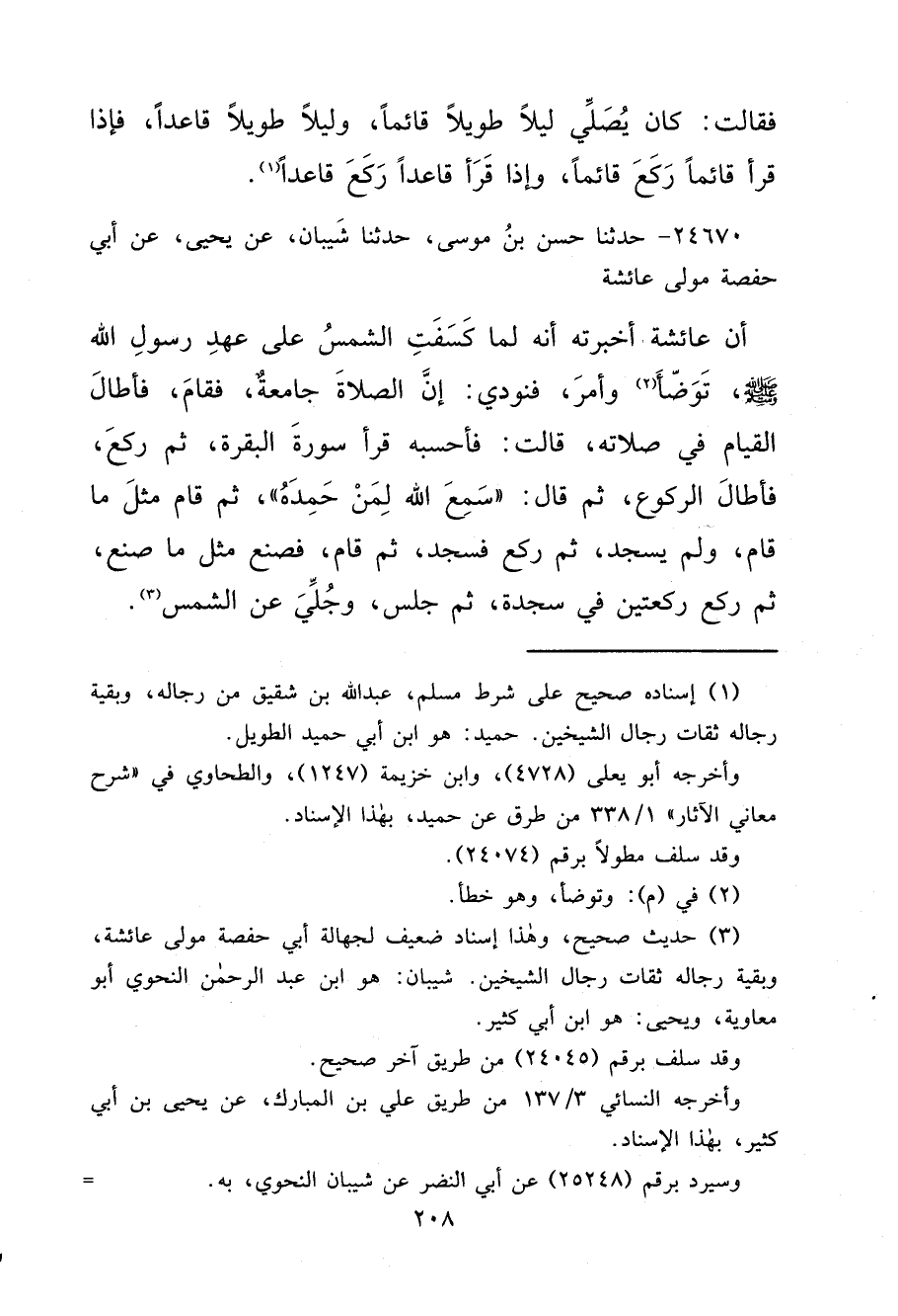 ٢٤٦٧٠ - حَدَّثَنَا حَسَنُ بْنُ مُوسَى، حَدَّثَنَا شَيْبَانُ، عَنْ يَحْيَى، عَنْ أَبِي حَفْصَةَ، مَوْلَى عَائِشَةَ، أَنَّ عَائِشَةَ، أَخْبَرَتْهُ، أَنَّهُ لَمَّا كَسَفَتِ الشَّمْسُ عَلَى عَهْدِ رَسُولِ اللهِ صَلَّى اللهُ عَلَيْهِ وَسَلَّمَ، تَوَضَّأَ (٢) وَأَمَرَ، فَنُودِيَ: إِنَّ الصَّلَاةَ جَامِعَةٌ، فَقَامَ، فَأَطَالَ الْقِيَامَ فِي صَلَاتِهِ، قَالَتْ: فَأَحْسِبُهُ قَرَأَ سُورَةَ الْبَقَرَةِ، ثُمَّ رَكَعَ، فَأَطَالَ الرُّكُوعَ، ثُمَّ قَالَ: " سَمِعَ اللهُ لِمَنْ حَمِدَهُ "، ثُمَّ قَامَ مِثْلَ مَا قَامَ، وَلَمْ يَسْجُدْ، ثُمَّ رَكَعَ، فَسَجَدَ، ثُمَّ قَامَ، فَصَنَعَ مِثْلَ مَا صَنَعَ، ثُمَّ رَكَعَ رَكْعَتَيْنِ فِي سَجْدَةٍ، ثُمَّ جَلَسَ وَجُلِّيَ عَنِ الشَّمْسِ (٣)