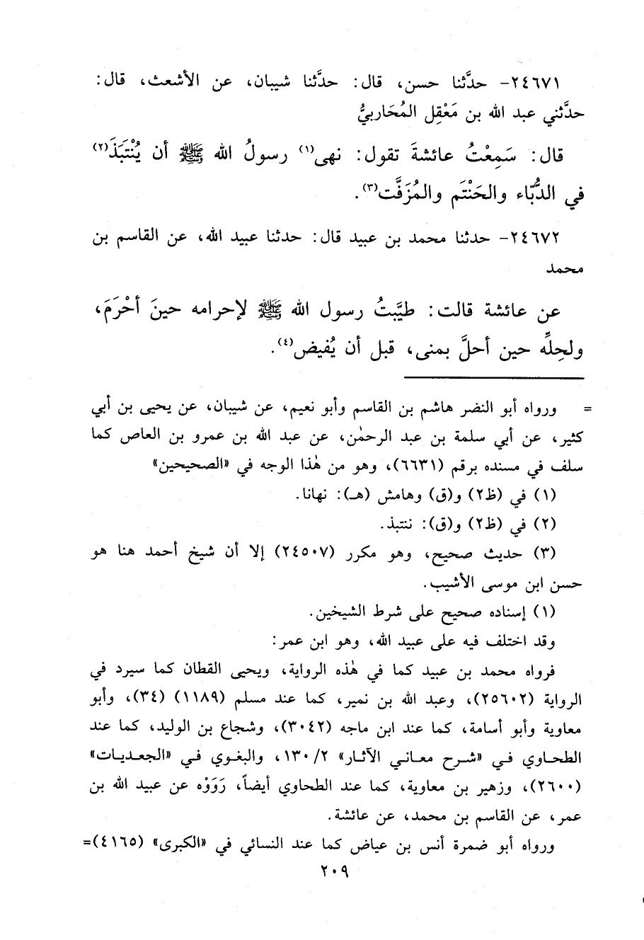 فرواه محمد بن عبيد كما في هذه الرواية، ويحيى القطان كما سيرد في الرواية (٢٥٦٠٢) ، وعبد الله بن نمير، كما عند مسلم (١١٨٩) (٣٤) ، وأبو معاوية وأبو أسامة، كما عند ابن ماجه (٣٠٤٢) ، وشجاع بن الوليد، كما عند الطحاوي في "شرح معاني الآثار" ٢ / ١٣٠، والبغوي في "الجعديات" (٢٦٠٠) ، وزهير بن معاوية، كما عند الطحاوي أيضاً، رَوَوْه عن عبيد الله بن عمر، عن القاسم بن محمد، عن عائشة.