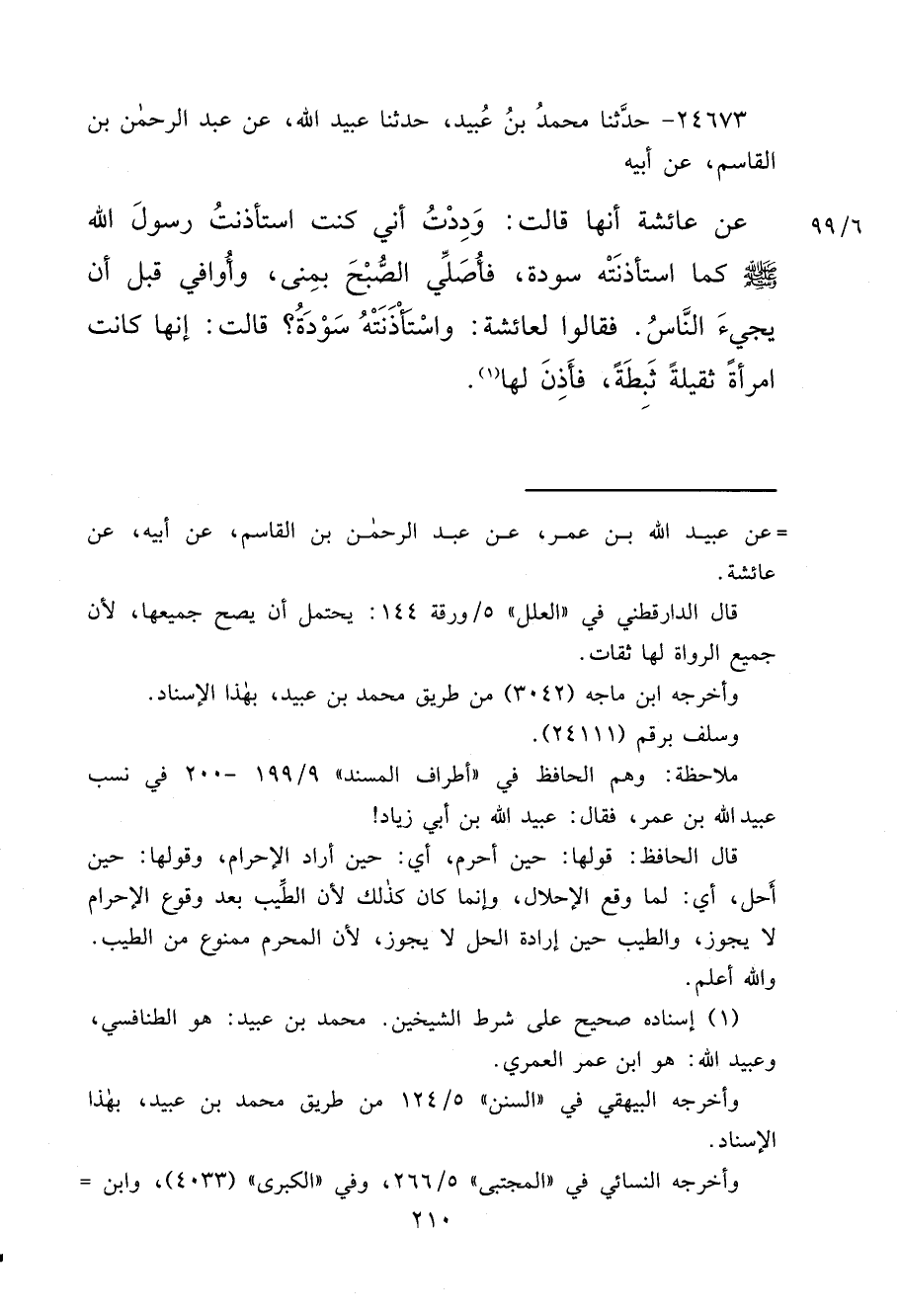 ٢٤٦٧٣ - حَدَّثَنَا مُحَمَّدُ بْنُ عُبَيْدٍ، حَدَّثَنَا عُبَيْدُ اللهِ، عَنْ عَبْدِ الرَّحْمَنِ بْنِ الْقَاسِمِ، عَنْ أَبِيهِ، عَنْ عَائِشَةَ، أَنَّهَا قَالَتْ: " وَدِدْتُ أَنِّي كُنْتُ اسْتَأْذَنْتُ رَسُولَ اللهِ صَلَّى اللهُ عَلَيْهِ وَسَلَّمَ كَمَا اسْتَأْذَنَتْهُ سَوْدَةُ، فَأُصَلِّي الصُّبْحَ بِمِنًى، وَأُوَافِي قَبْلَ أَنْ يَجِيءَ النَّاسُ "، فَقَالُوا لِعَائِشَةَ: وَاسْتَأْذَنَتْهُ سَوْدَةُ؟ قَالَتْ: " إِنَّهَا كَانَتْ امْرَأَةً ثَقِيلَةً ثَبِطَةً، فَأَذِنَ لَهَا " (١)
