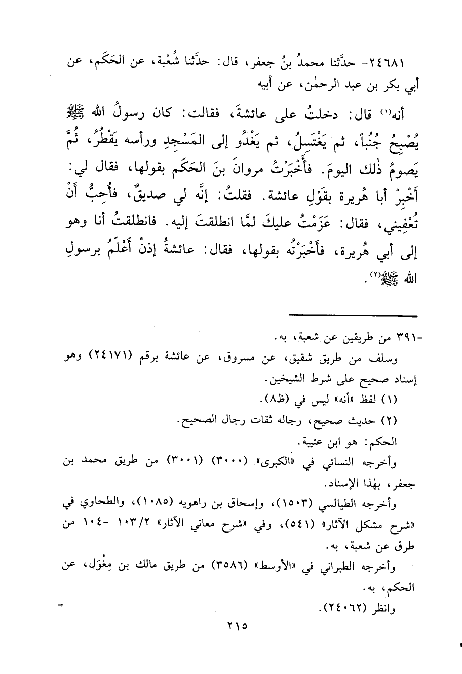 ٢٤٦٨١ - حَدَّثَنَا مُحَمَّدُ بْنُ جَعْفَرٍ، قَالَ: حَدَّثَنَا شُعْبَةُ، عَنْ الْحَكَمِ، عَنْ أَبِي بَكْرِ بْنِ عَبْدِ الرَّحْمَنِ، عَنْ أَبِيهِ، أَنَّهُ (١) قَالَ: دَخَلْتُ عَلَى عَائِشَةَ، فَقَالَتْ: " كَانَ رَسُولُ اللهِ صَلَّى اللهُ عَلَيْهِ وَسَلَّمَ يُصْبِحُ جُنُبًا، ثُمَّ يَغْتَسِلُ، ثُمَّ يَغْدُو إِلَى الْمَسْجِدِ، وَرَأْسُهُ يَقْطُرُ، ثُمَّ يَصُومُ ذَلِكَ الْيَوْمَ "، فَأَخْبَرْتُ مَرْوَانَ بْنَ الْحَكَمِ بِقَوْلِهَا، فَقَالَ لِي: أَخْبِرْ أَبَا هُرَيْرَةَ بِقَوْلِ عَائِشَةَ، فَقُلْتُ: إِنَّهُ لِي صَدِيقٌ، فَأُحِبُّ أَنْ تُعْفِيَنِي، فَقَالَ: عَزَمْتُ عَلَيْكَ لَمَا انْطَلَقْتَ إِلَيْهِ، فَانْطَلَقْتُ أَنَا وَهُوَ إِلَى أَبِي هُرَيْرَةَ، فَأَخْبَرْتُهُ بِقَوْلِهَا، فَقَالَ: عَائِشَةُ إِذَنْ أَعْلَمُ بِرَسُولِ اللهِ صَلَّى اللهُ عَلَيْهِ وَسَلَّمَ (٢)