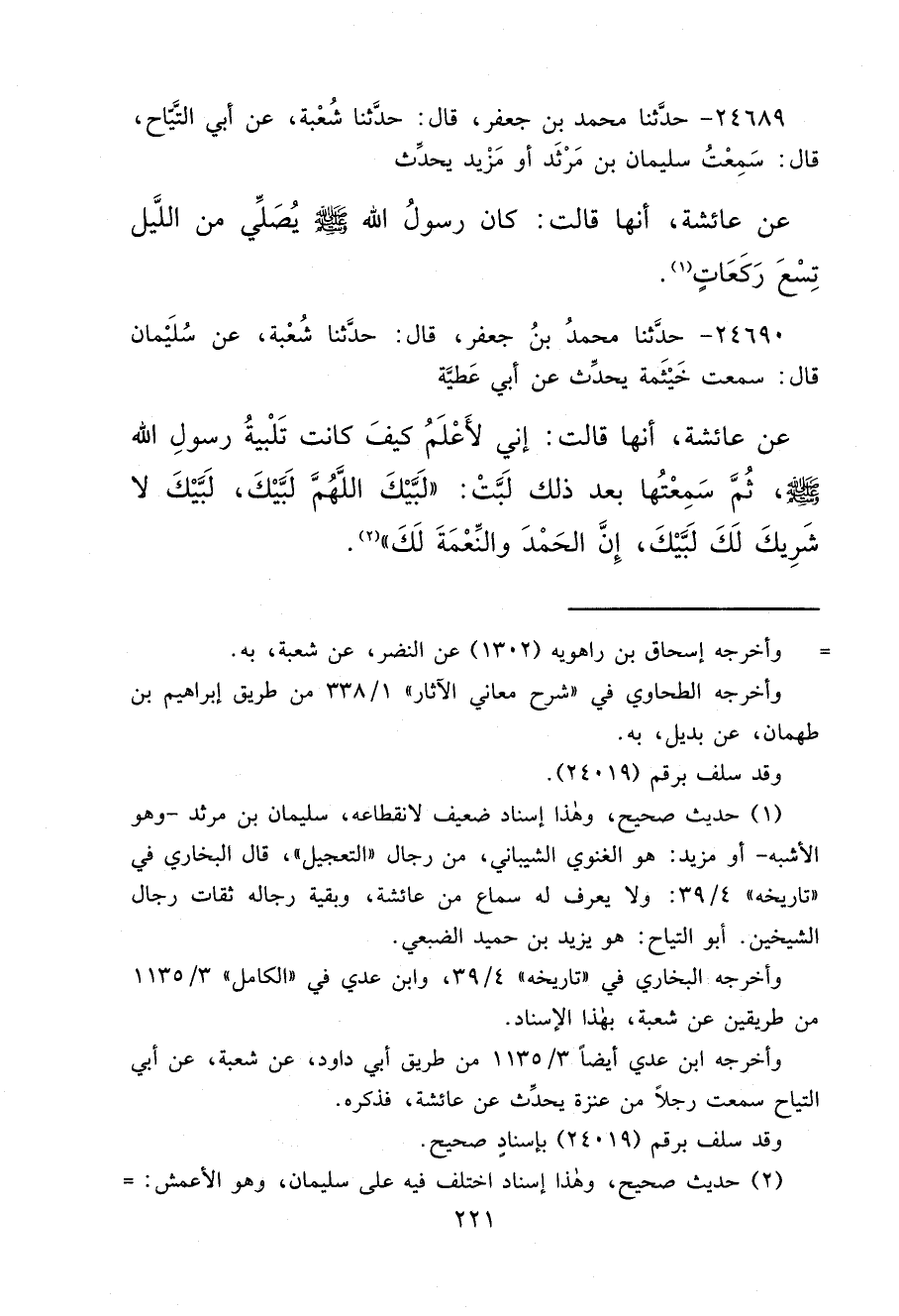 ٢٤٦٩٠ - حَدَّثَنَا مُحَمَّدُ بْنُ جَعْفَرٍ، قَالَ: حَدَّثَنَا شُعْبَةُ، عَنْ سُلَيْمَانَ، قَالَ: سَمِعْتُ خَيْثَمَةَ، يُحَدِّثُ عَنْ أَبِي عَطِيَّةَ، عَنْ عَائِشَةَ، أَنَّهَا قَالَتْ: " إِنِّي لَأَعْلَمُ كَيْفَ كَانَتْ تَلْبِيَةُ رَسُولِ اللهِ صَلَّى اللهُ عَلَيْهِ وَسَلَّمَ، ثُمَّ سَمِعْتُهَا بَعْدَ ذَلِكَ لَبَّتْ: لَبَّيْكَ اللهُمَّ لَبَّيْكَ، لَبَّيْكَ لَا شَرِيكَ لَكَ، لَبَّيْكَ إِنَّ الْحَمْدَ وَالنِّعْمَةَ لَكَ " (٢)