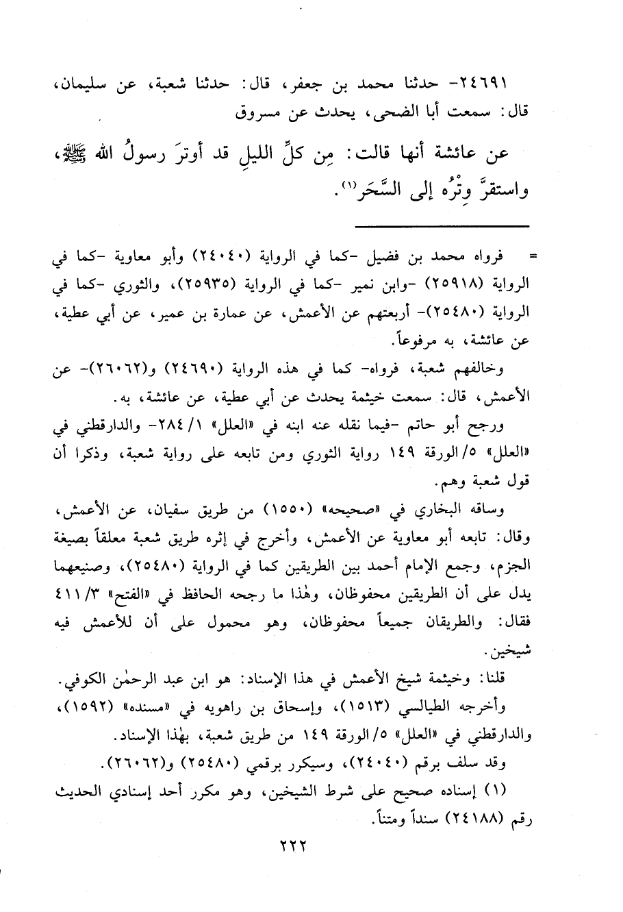 ٢٤٦٩١ - حَدَّثَنَا مُحَمَّدُ بْنُ جَعْفَرٍ، قَالَ: حَدَّثَنَا شُعْبَةُ، عَنْ سُلَيْمَانَ، قَالَ: سَمِعْتُ أَبَا الضُّحَى، يُحَدِّثُ عَنْ مَسْرُوقٍ، عَنْ عَائِشَةَ، أَنَّهَا قَالَتْ: " مِنْ كُلِّ اللَّيْلِ قَدْ أَوْتَرَ رَسُولُ اللهِ صَلَّى اللهُ عَلَيْهِ وَسَلَّمَ، وَاسْتَقَرَّ وِتْرُهُ إِلَى السَّحَرِ " (١)