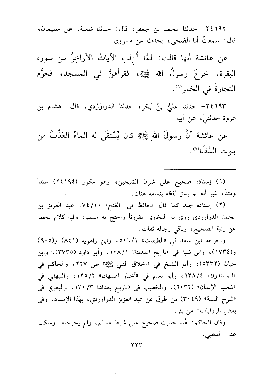 ٢٤٦٩٣ - حَدَّثَنَا عَلِيُّ بْنُ بَحْرٍ، حَدَّثَنَا الدَّرَاوَرْدِيُّ، قَالَ هِشَامُ بْنُ عُرْوَةَ: حَدَّثَنِي عَنْ أَبِيهِ، عَنْ عَائِشَةَ، " أَنَّ رَسُولَ اللهِ صَلَّى اللهُ عَلَيْهِ وَسَلَّمَ كَانَ يُسْتَقَى لَهُ الْمَاءُ الْعَذْبُ مِنْ بُيُوتِ السُّقْيَا " (٢)