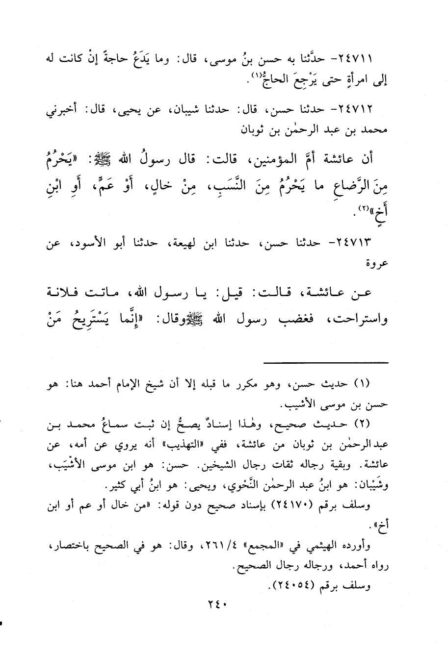 ٢٤٧١٢ - حَدَّثَنَا حَسَنٌ، قَالَ: حَدَّثَنَا شَيْبَانُ، عَنْ يَحْيَى، قَالَ: أَخْبَرَنِي مُحَمَّدُ بْنُ عَبْدِ الرَّحْمَنِ بْنِ ثَوْبَانَ، أَنَّ عَائِشَةَ أُمَّ الْمُؤْمِنِينَ، قَالَتْ: قَالَ رَسُولُ اللهِ صَلَّى اللهُ عَلَيْهِ وَسَلَّمَ: " يَحْرُمُ مِنَ الرَّضَاعِ مَا يَحْرُمُ مِنَ النَّسَبِ، مِنْ خَالٍ، أَوْ عَمٍّ، أَوْ ابْنِ أَخٍ " (٢)