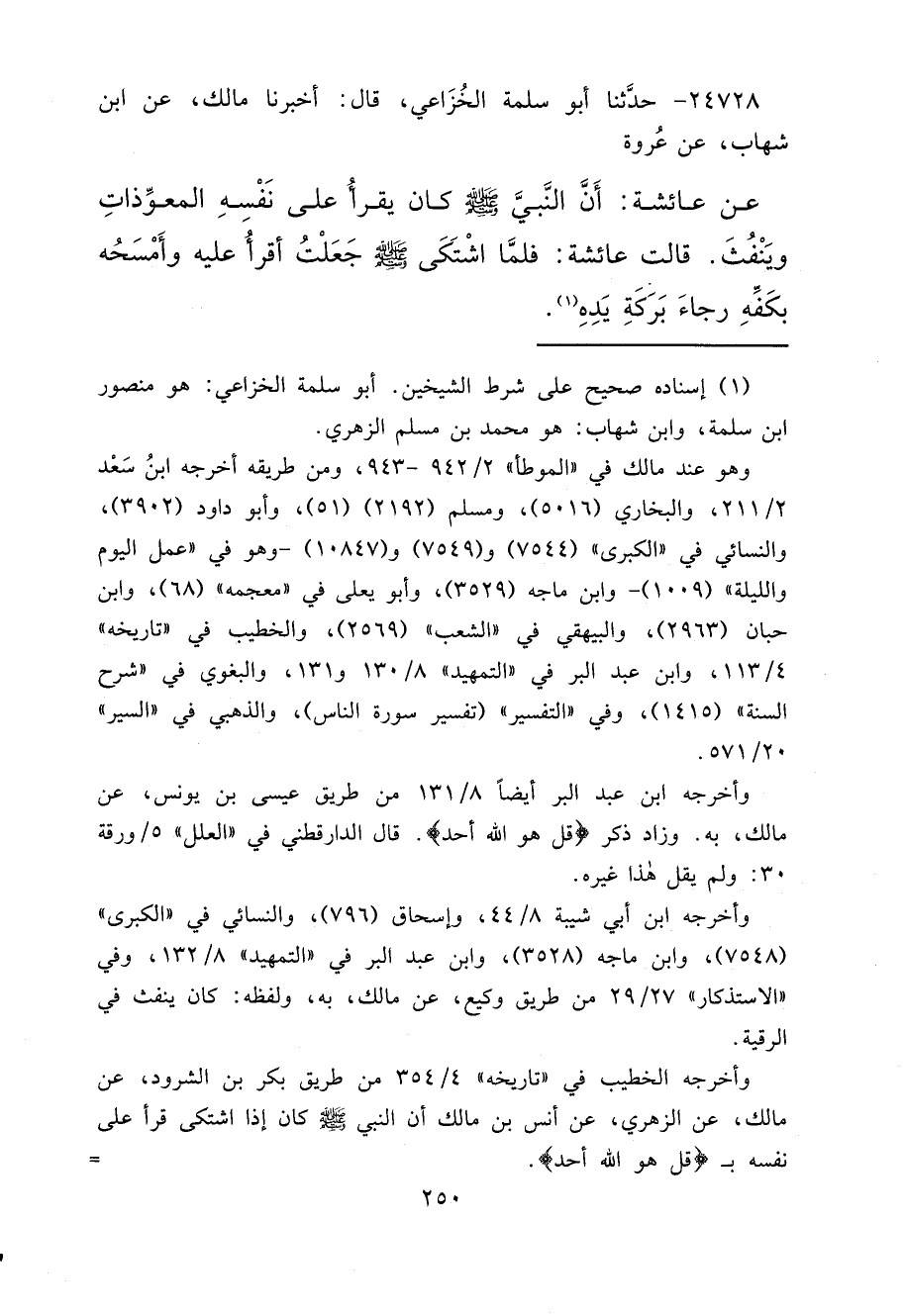 ٢٤٧٢٨ - حَدَّثَنَا أَبُو سَلَمَةَ الْخُزَاعِيُّ، قَالَ: أَخْبَرَنَا مَالِكٌ، عَنْ ابْنِ شِهَابٍ، عَنْ عُرْوَةَ، عَنْ عَائِشَةَ، " أَنَّ النَّبِيَّ صَلَّى اللهُ عَلَيْهِ وَسَلَّمَ كَانَ يَقْرَأُ عَلَى نَفْسِهِ الْمُعَوِّذَاتِ، وَيَنْفُثُ "، قَالَتْ عَائِشَةُ: " فَلَمَّا اشْتَكَى صَلَّى اللهُ عَلَيْهِ وَسَلَّمَ، جَعَلْتُ أَقْرَأُ عَلَيْهِ، وَأَمْسَحُهُ بِكَفِّهِ، رَجَاءَ بَرَكَةِ يَدِهِ " (١)