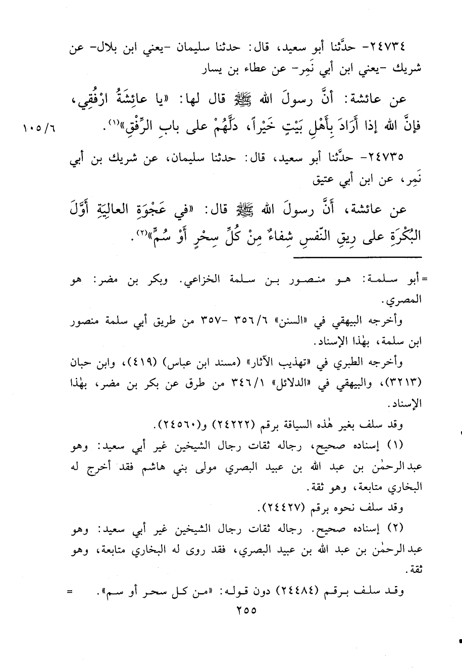 ٢٤٧٣٥ - حَدَّثَنَا أَبُو سَعِيدٍ، قَالَ: حَدَّثَنَا سُلَيْمَانُ، عَنْ شَرِيكِ بْنِ أَبِي نَمِرٍ، عَنْ ابْنِ أَبِي عَتِيقٍ، عَنْ عَائِشَةَ، أَنَّ رَسُولَ اللهِ صَلَّى اللهُ عَلَيْهِ وَسَلَّمَ، قَالَ: " فِي عَجْوَةِ الْعَالِيَةِ، أَوَّلَ الْبُكْرَةِ عَلَى رِيقِ النَّفْسِ شِفَاءٌ مِنْ كُلِّ سِحْرٍ، أَوْ سُمٍّ " (٢)