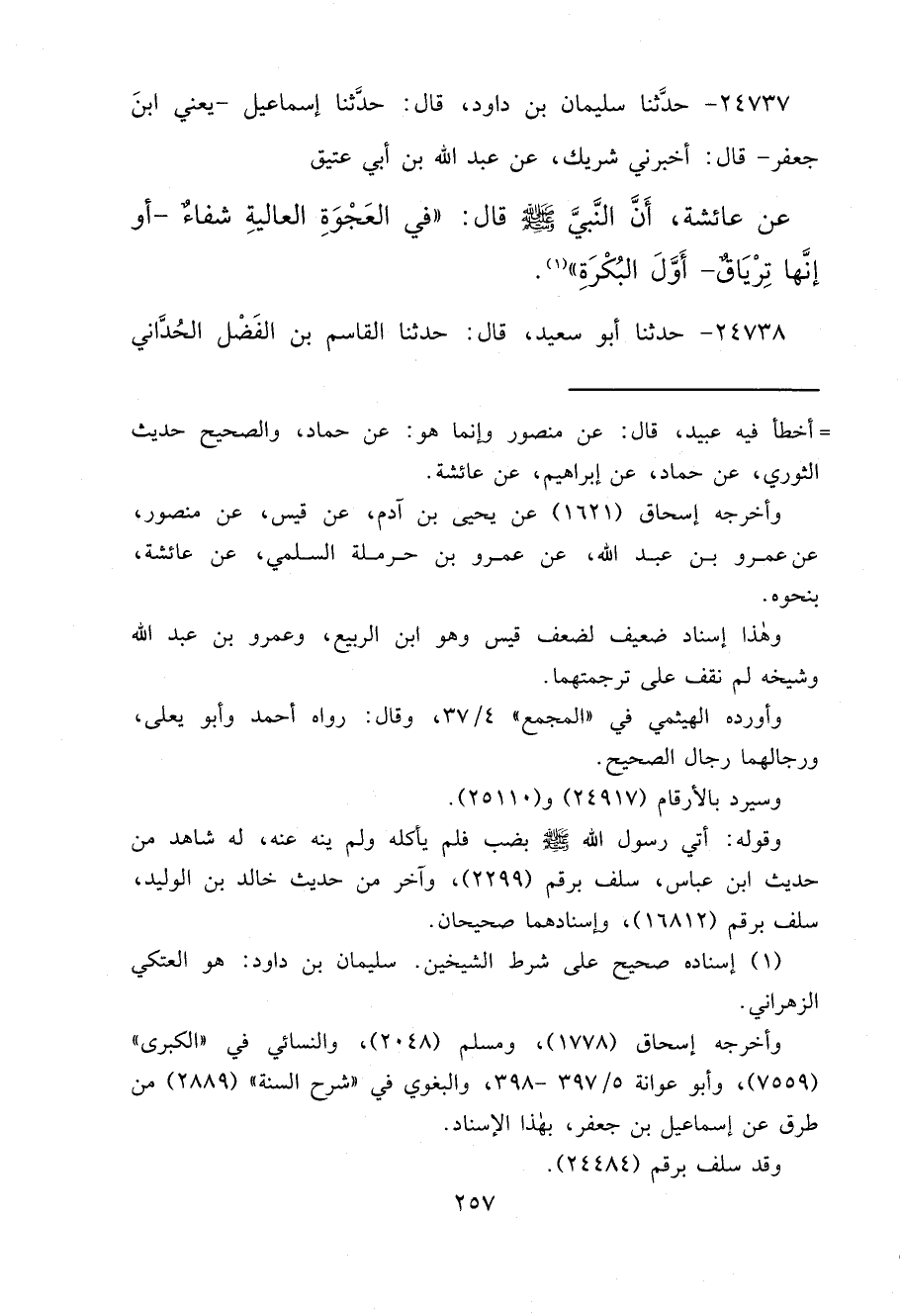 ٢٤٧٣٧ - حَدَّثَنَا سُلَيْمَانُ بْنُ دَاوُدَ، قَالَ: حَدَّثَنَا إِسْمَاعِيلُ يَعْنِي ابْنَ جَعْفَرٍ، قَالَ: أَخْبَرَنِي شَرِيكٌ، عَنْ عَبْدِ اللهِ بْنِ أَبِي عَتِيقٍ، عَنْ عَائِشَةَ، أَنَّ النَّبِيَّ صَلَّى اللهُ عَلَيْهِ وَسَلَّمَ، قَالَ: " فِي الْعَجْوَةِ الْعَالِيَةِ شِفَاءٌ، أَوْ إِنَّهَا تِرْيَاقٌ، أَوَّلَ الْبُكْرَةِ " (١)
