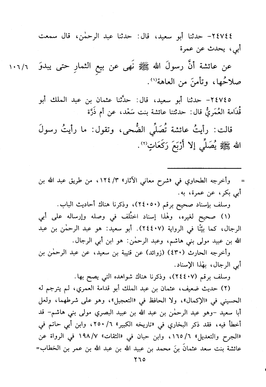 ٢٤٧٤٤ - حَدَّثَنَا أَبُو سَعِيدٍ، قَالَ: حَدَّثَنَا عَبْدُ الرَّحْمَنِ، قَالَ: سَمِعْتُ أَبِي يُحَدِّثُ عَنْ عَمْرَةَ، عَنْ عَائِشَةَ، " أَنَّ رَسُولَ اللهِ صَلَّى اللهُ عَلَيْهِ وَسَلَّمَ نَهَى عَنْ بَيْعِ الثِّمَارِ حَتَّى يَبْدُوَ صَلَاحُهَا، وَتَأْمَنَ مِنَ الْعَاهَةِ " (١)