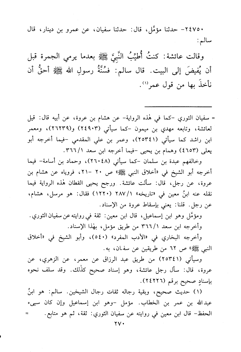 ٢٤٧٥٠ - حَدَّثَنَا مُؤَمَّلٌ، قَالَ: حَدَّثَنَا سُفْيَانُ، عَنْ عَمْرِو بْنِ دِينَارٍ، قَالَ سَالِمٌ: وَقَالَتْ عَائِشَةُ: " كُنْتُ أُطَيِّبُ النَّبِيَّ صَلَّى اللهُ عَلَيْهِ وَسَلَّمَ بَعْدَمَا يَرْمِي الْجَمْرَةَ، قَبْلَ أَنْ يُفِيضَ إِلَى الْبَيْتِ "، قَالَ سَالِمٌ: " فَسُنَّةُ رَسُولِ اللهِ صَلَّى اللهُ عَلَيْهِ وَسَلَّمَ أَحَقُّ أَنْ نَأْخُذَ بِهَا مِنْ قَوْلِ عُمَرَ " (١)