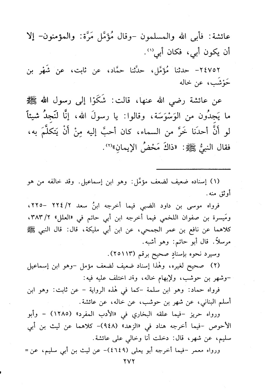 ٢٤٧٥٢ - حَدَّثَنَا مُؤَمَّلٌ، حَدَّثَنَا حَمَّادٌ، عَنْ ثَابِتٍ، عَنْ شَهْرِ بْنِ حَوْشَبٍ، عَنْ خَالِهِ، عَنْ عَائِشَةَ رَضِيَ اللهُ عَنْهَا، قَالَتْ: شَكَوْا إِلَى رَسُولِ اللهِ صَلَّى اللهُ عَلَيْهِ وَسَلَّمَ مَا يَجِدُونَ مِنَ الْوَسْوَسَةِ، وَقَالُوا: يَا رَسُولَ اللهِ، إِنَّا لَنَجِدُ شَيْئًا لَوْ أَنَّ أَحَدَنَا خَرَّ مِنَ السَّمَاءِ كَانَ أَحَبَّ إِلَيْهِ مِنْ أَنْ يَتَكَلَّمَ بِهِ، فَقَالَ النَّبِيُّ صَلَّى اللهُ عَلَيْهِ وَسَلَّمَ: " ذَاكَ مَحْضُ الْإِيمَانِ " (٢)