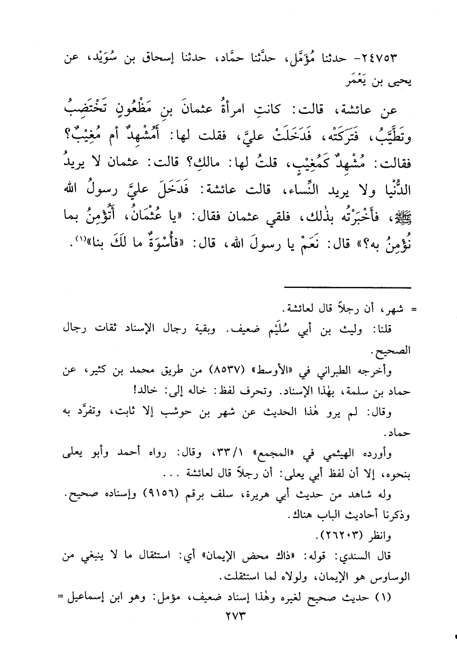 ٢٤٧٥٣ - حَدَّثَنَا مُؤَمَّلٌ، حَدَّثَنَا حَمَّادٌ، حَدَّثَنَا إِسْحَاقُ بْنُ سُوَيْدٍ، عَنْ يَحْيَى بْنِ يَعْمَرَ، عَنْ عَائِشَةَ، قَالَتْ: كَانَتْ امْرَأَةُ عُثْمَانَ بْنِ مَظْعُونٍ تَخْتَضِبُ، وَتَطَيَّبُ، فَتَرَكَتْهُ، فَدَخَلَتْ عَلَيَّ، فَقُلْتُ لَهَا: أَمُشْهِدٌ، أَمْ مُغِيبٌ؟ فَقَالَتْ: مُشْهِدٌ كَمُغِيبٍ، قُلْتُ لَهَا: مَا لَكِ؟ قَالَتْ: عُثْمَانُ لَا يُرِيدُ الدُّنْيَا، وَلَا يُرِيدُ النِّسَاءَ، قَالَتْ عَائِشَةُ: فَدَخَلَ عَلَيَّ رَسُولُ اللهِ صَلَّى اللهُ عَلَيْهِ وَسَلَّمَ، فَأَخْبَرْتُهُ بِذَلِكَ، فَلَقِيَ عُثْمَانَ، فَقَالَ: " يَا عُثْمَانُ، أَتُؤْمِنُ بِمَا نُؤْمِنُ بِهِ؟ " قَالَ: نَعَمْ، يَا رَسُولَ اللهِ، قَالَ: " فَأُسْوَةٌ مَا لَكَ بِنَا "، (١)