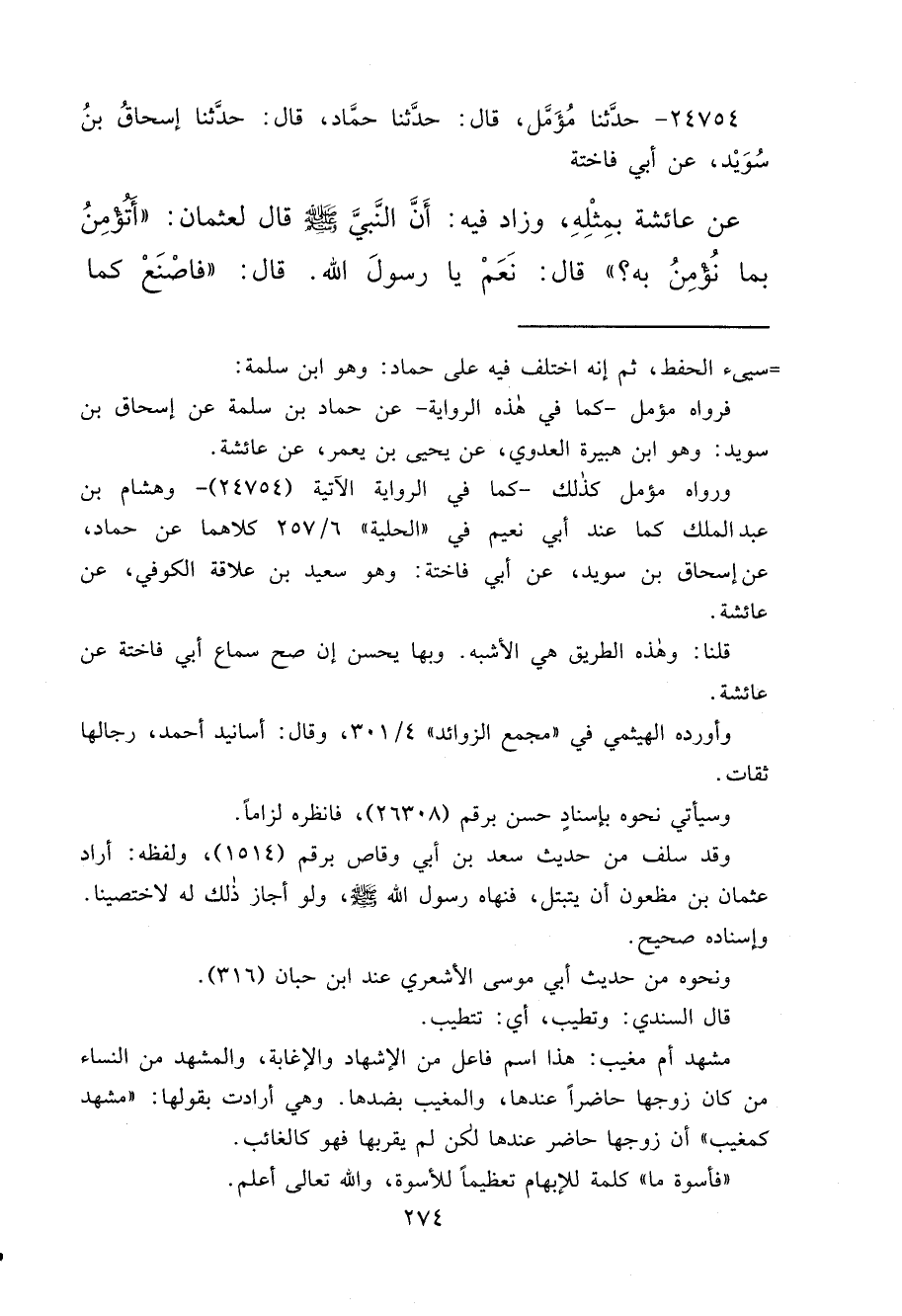 ٢٤٧٥٤ - حَدَّثَنَا مُؤَمَّلٌ، قَالَ: حَدَّثَنَا حَمَّادٌ، قَالَ: حَدَّثَنَا إِسْحَاقُ بْنُ سُوَيْدٍ، عَنْ أَبِي فَاخِتَةَ، عَنْ عَائِشَةَ بِمِثْلِهِ، وَزَادَ فِيهِ أَنَّ النَّبِيَّ صَلَّى اللهُ عَلَيْهِ وَسَلَّمَ قَالَ لِعُثْمَانَ: " أَتُؤْمِنُ بِمَا نُؤْمِنُ بِهِ؟ "، قَالَ: نَعَمْ، يَا رَسُولَ اللهِ، قَالَ: " فَاصْنَعْ كَمَا