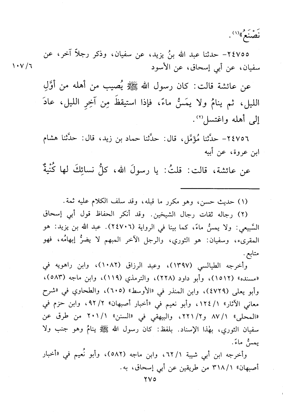 ٢٤٧٥٥ - حَدَّثَنَا عَبْدُ اللهِ بْنُ يَزِيدَ، عَنْ سُفْيَانَ، وَذَكَرَ رَجُلًا آخَرَ، عَنْ سُفْيَانَ، عَنْ أَبِي إِسْحَاقَ، عَنْ الْأَسْوَدِ، عَنْ عَائِشَةَ، قَالَتْ: " كَانَ رَسُولُ اللهِ صَلَّى اللهُ عَلَيْهِ وَسَلَّمَ يُصِيبُ مِنْ أَهْلِهِ مِنْ أَوَّلِ اللَّيْلِ، ثُمَّ يَنَامُ وَلَا يَمَسُّ مَاءً، فَإِذَا اسْتَيْقَظَ مِنْ آخِرِ اللَّيْلِ، عَادَ إِلَى أَهْلِهِ، وَاغْتَسَلَ " (٢)