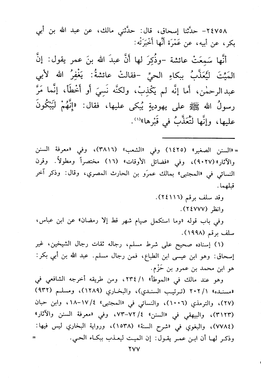 ٢٤٧٥٨ - حَدَّثَنَا إِسْحَاقُ، قَالَ: حَدَّثَنِي مَالِكٌ، عَنْ عَبْدِ اللهِ بْنِ أَبِي بَكْرٍ، عَنْ أَبِيهِ، عَنْ عَمْرَةَ، أَنَّهَا أَخْبَرَتْهُ أَنَّهَا، سَمِعَتْ عَائِشَةَ، وَذُكِرَ لَهَا أَنَّ عَبْدَ اللهِ بْنَ عُمَرَ يَقُولُ: إِنَّ الْمَيِّتَ لَيُعَذَّبُ بِبُكَاءِ الْحَيِّ، فَقَالَتْ عَائِشَةُ: يَغْفِرُ اللهُ لِأَبِي عَبْدِ الرَّحْمَنِ، أَمَا إِنَّهُ لَمْ يَكْذِبْ، وَلَكِنَّهُ نَسِيَ، أَوْ أَخْطَأَ، إِنَّمَا مَرَّ رَسُولُ اللهِ صَلَّى اللهُ عَلَيْهِ وَسَلَّمَ، عَلَى يَهُودِيَّةٍ يُبْكَى عَلَيْهَا، فَقَالَ: " إِنَّهُمْ لَيَبْكُونَ عَلَيْهَا، وَإِنَّهَا لَتُعَذَّبُ فِي قَبْرِهَا " (١)