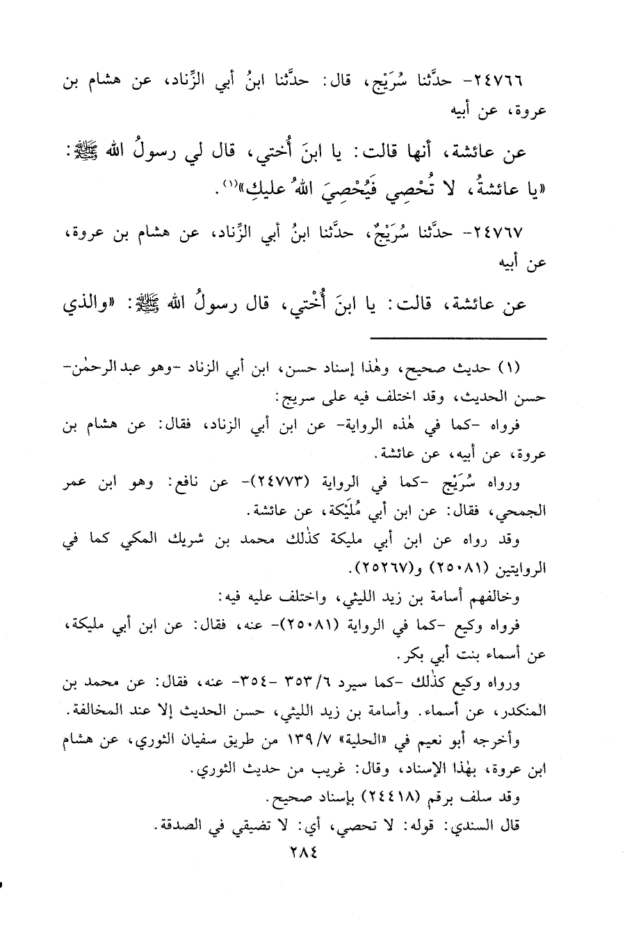 ٢٤٧٦٦ - حَدَّثَنَا سُرَيْجٌ، قَالَ: حَدَّثَنَا ابْنُ أَبِي الزِّنَادِ، عَنْ هِشَامِ بْنِ عُرْوَةَ، عَنْ أَبِيهِ، عَنْ عَائِشَةَ، أَنَّهَا قَالَتْ: يَا ابْنَ أُخْتِي، قَالَ لِي رَسُولُ اللهِ صَلَّى اللهُ عَلَيْهِ وَسَلَّمَ: " يَا عَائِشَةُ، لَا تُحْصِي فَيُحْصِيَ اللهُ عَلَيْكِ " (١)