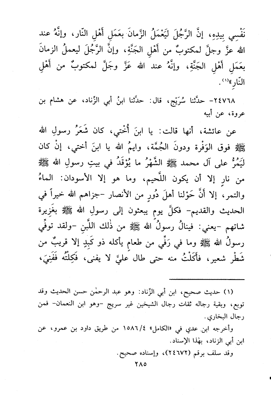 ٢٤٧٦٨ - حَدَّثَنَا سُرَيْجٌ، قَالَ: حَدَّثَنَا ابْنُ أَبِي الزِّنَادِ، عَنْ هِشَامِ بْنِ عُرْوَةَ، عَنْ أَبِيهِ، عَنْ عَائِشَةَ، أَنَّهَا قَالَتْ: " يَا ابْنَ أُخْتِي، كَانَ شَعْرُ رَسُولِ اللهِ صَلَّى اللهُ عَلَيْهِ وَسَلَّمَ فَوْقَ الْوَفْرَةِ، وَدُونَ الْجُمَّةِ، وَايْمُ اللهِ يَا ابْنَ أُخْتِي، إِنْ كَانَ لَيَمُرُّ عَلَى آلِ مُحَمَّدٍ صَلَّى اللهُ عَلَيْهِ وَسَلَّمَ الشَّهْرُ، مَا يُوقَدُ فِي بَيْتِ رَسُولِ اللهِ صَلَّى اللهُ عَلَيْهِ وَسَلَّمَ مِنْ نَارٍ، إِلَّا أَنْ يَكُونَ اللُّحَيْمُ، وَمَا هُوَ إِلَّا الْأَسْوَدَانِ: الْمَاءُ وَالتَّمْرُ، إِلَّا أَنَّ حَوْلَنَا أَهْلَ دُورٍ مِنَ الْأَنْصَارِ جَزَاهُمُ اللهُ خَيْرًا فِي الْحَدِيثِ وَالْقَدِيمِ، فَكُلُّ يَوْمٍ يَبْعَثُونَ إِلَى رَسُولِ اللهِ صَلَّى اللهُ عَلَيْهِ وَسَلَّمَ بِغَزِيرَةِ شَاتِهِمْ، يَعْنِي: فَيَنَالُ رَسُولُ اللهِ صَلَّى اللهُ عَلَيْهِ وَسَلَّمَ مِنْ ذَلِكَ اللَّبَنِ، وَلَقَدْ تُوُفِّيَ رَسُولُ اللهِ صَلَّى اللهُ عَلَيْهِ وَسَلَّمَ وَمَا فِي رَفِّي مِنْ طَعَامٍ يَأْكُلُهُ ذُو كَبِدٍ إِلَّا قَرِيبٌ مِنْ شَطْرِ شَعِيرٍ، فَأَكَلْتُ مِنْهُ حَتَّى طَالَ عَلَيَّ لَا يَفْنَى، فَكِلْتُهُ فَفَنِيَ،