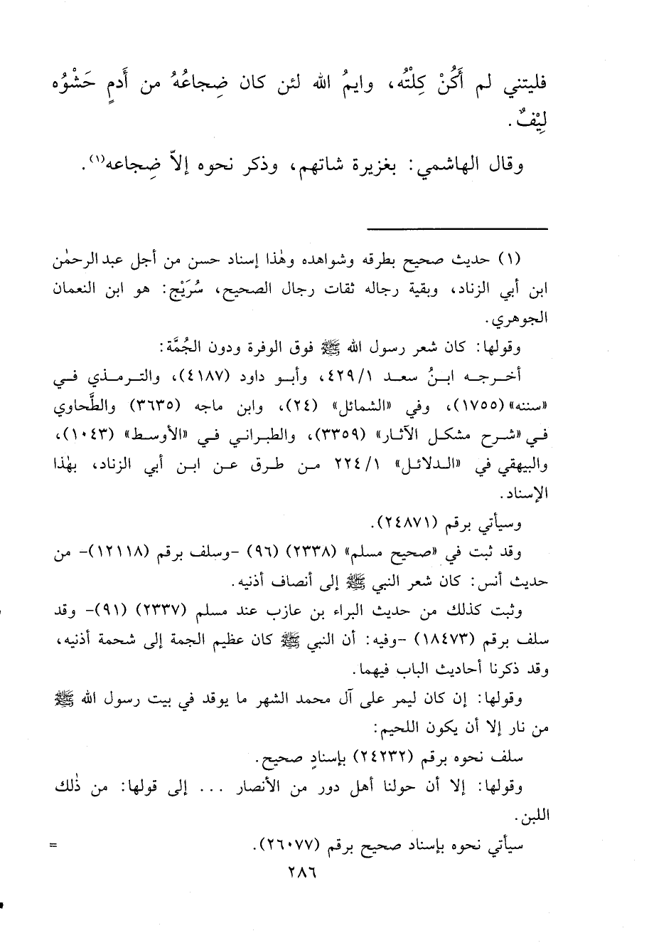 فَلَيْتَنِي لَمْ أَكُنْ كِلْتُهُ، وَايْمُ اللهِ لَأَنْ كَانَ ضِجَاعُهُ مِنْ أَدَمٍ حَشْوُهُ لِيفٌ "، وقَالَ الْهَاشِمِيُّ: بِغَزِيرَةِ شَاتِهِمْ، وَذَكَرَ نَحْوَهُ إِلَّا ضِجَاعُهُ (١)