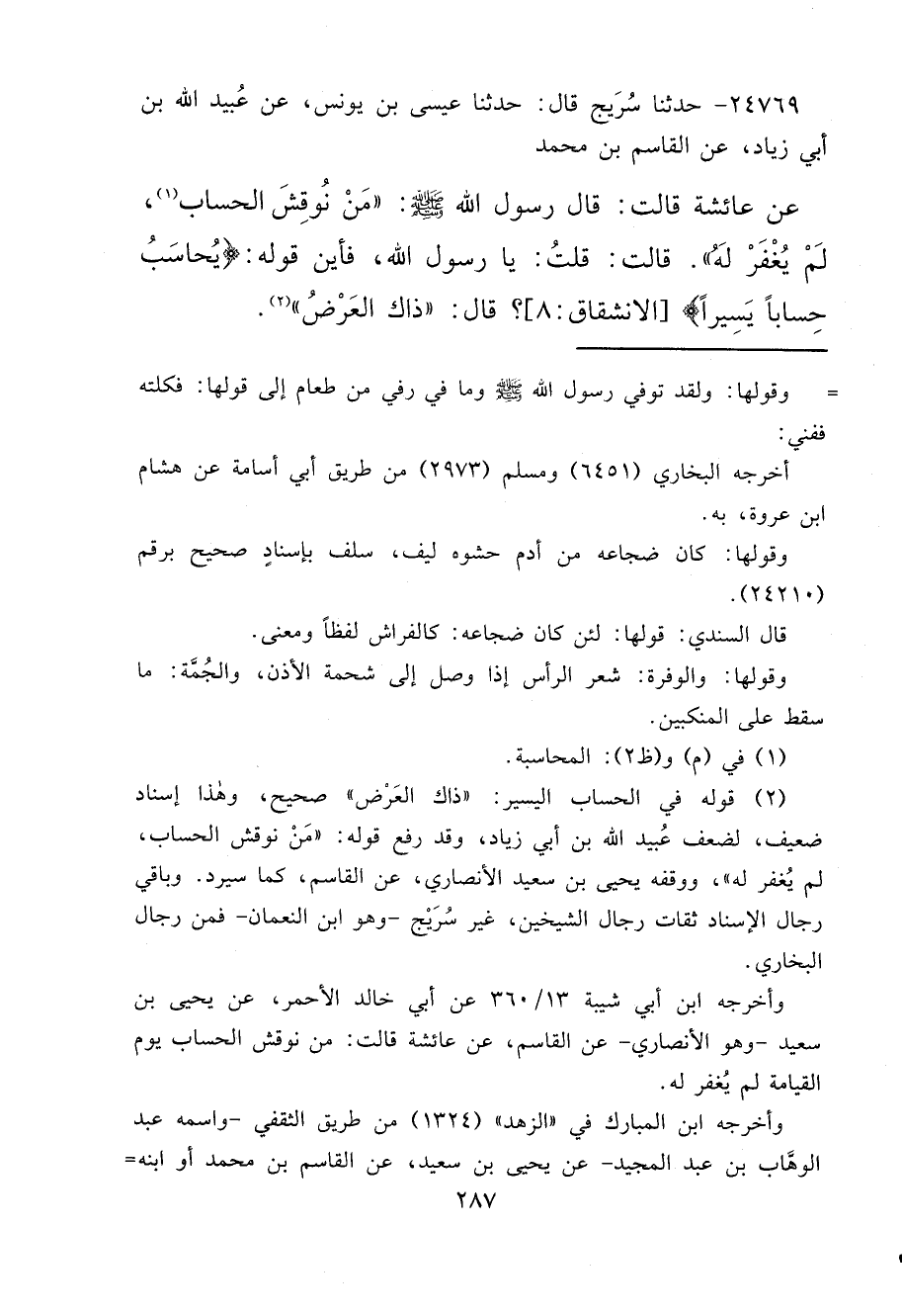(٢) قوله في الحساب اليسير: "ذاك العَرْض" صحيح، وهذا إسناد ضعيف، لضعف عُبيد الله بن أبي زياد، وقد رفع قوله: "مَنْ نوقش الحساب، لم يُغفر له"، ووقفه يحيى بن سعيد الأنصاري، عن القاسم، كما سيرد. وباقي رجال الإسناد ثقات رجال الشيخين، غير سُرَيْج - وهو ابن النعمان - فمن رجال البخاري.