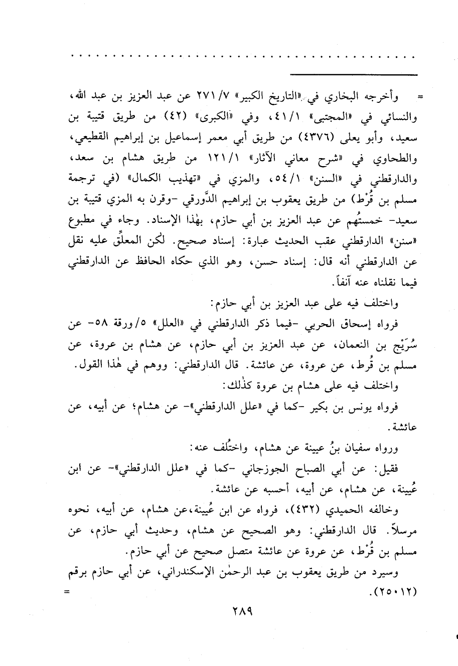 مسلم بن قُرْط) من طريق يعقوب بن إبراهيم الدَّورقي - وقرن به المزي قتيبة بن سعيد - خمستُهم عن عبد العزيز بن أبي حازم، بهذا الإسناد. وجاء في مطبوع "سنن" الدارقطني عقب الحديث عبارة: إسناد صحيح. لكن المعلِّق عليه نقل عن الدارقطني أنه قال: إسناد حسن، وهو الذي حكاه الحافظ عن الدارقطني فيما نقلناه عنه آنفاً.