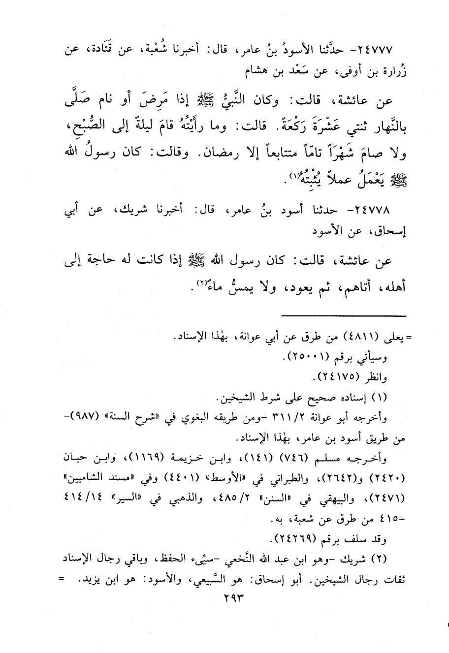 ٢٤٧٧٨ - حَدَّثَنَا أَسْوَدُ بْنُ عَامِرٍ، قَالَ: أَخْبَرَنَا شَرِيكٌ، عَنْ أَبِي إِسْحَاقَ، عَنْ الْأَسْوَدِ، عَنْ عَائِشَةَ، قَالَتْ: " كَانَ رَسُولُ اللهِ صَلَّى اللهُ عَلَيْهِ وَسَلَّمَ إِذَا كَانَتْ لَهُ حَاجَةٌ إِلَى أَهْلِهِ أَتَاهُمْ، ثُمَّ يَعُودُ وَلَا يَمَسُّ مَاءً " (٢)