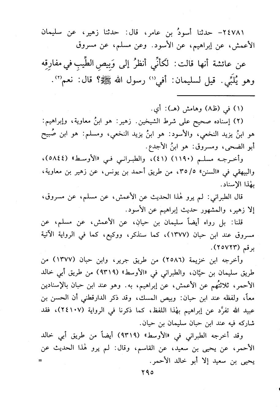 ٢٤٧٨١ - حَدَّثَنَا أَسْوَدُ بْنُ عَامِرٍ، قَالَ: حَدَّثَنَا زُهَيْرٌ، عَنْ سُلَيْمَانَ الْأَعْمَشِ، عَنْ إِبْرَاهِيمَ، عَنْ الْأَسْوَدِ، وَعَنْ مُسْلِمٍ، عَنْ مَسْرُوقٍ، عَنْ عَائِشَةَ، أَنَّهَا قَالَتْ: " لَكَأَنِّي أَنْظُرُ إِلَى وَبِيصِ الطِّيبِ فِي مَفَارِقِهِ وَهُوَ يُلَبِّي "، قَيْلَ لِسُلَيْمَانَ: أَفِي (١) رَسُولِ اللهِ صَلَّى اللهُ عَلَيْهِ وَسَلَّمَ؟ قَالَ: " نَعَمْ " (٢)