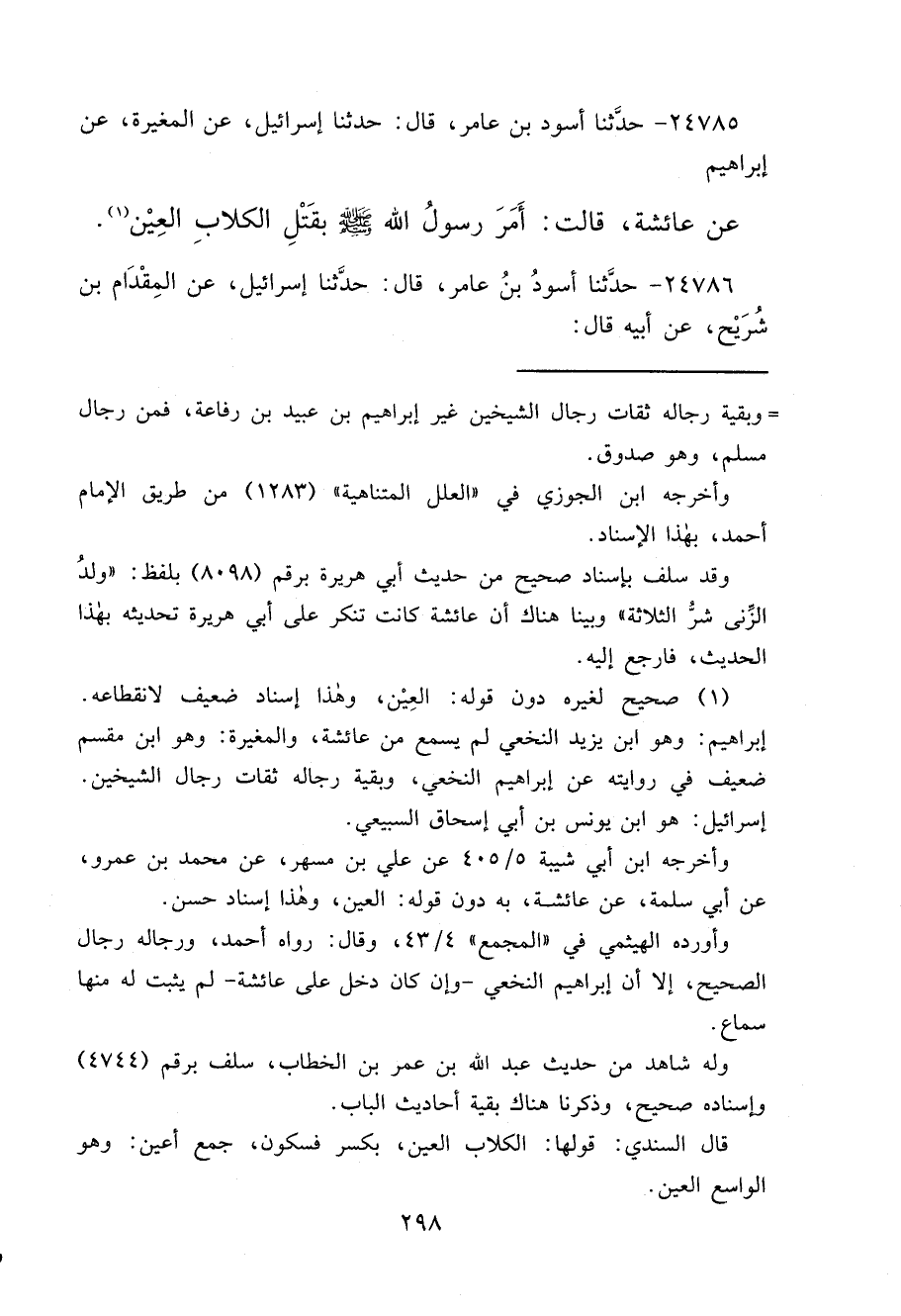 ٢٤٧٨٥ - حَدَّثَنَا أَسْوَدُ بْنُ عَامِرٍ، قَالَ: حَدَّثَنَا إِسْرَائِيلُ، عَنْ الْمُغِيرَةِ، عَنْ إِبْرَاهِيمَ، عَنْ عَائِشَةَ، قَالَتْ: " أَمَرَ رَسُولُ اللهِ صَلَّى اللهُ عَلَيْهِ وَسَلَّمَ بِقَتْلِ الْكِلَابِ الْعِينِ " (١)