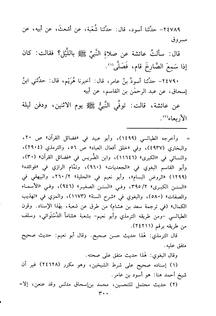 ٢٤٧٨٩ - حَدَّثَنَا أَسْوَدُ، قَالَ: حَدَّثَنَا شُعْبَةُ، عَنْ أَشْعَثَ، عَنْ أَبِيهِ، عَنْ مَسْرُوقٍ، قَالَ: سَأَلْتُ عَائِشَةَ عَنْ صَلَاةِ النَّبِيِّ صَلَّى اللهُ عَلَيْهِ وَسَلَّمَ بِاللَّيْلِ، فَقَالَتْ: " كَانَ إِذَا سَمِعَ الصَّارِخَ، قَامَ فَصَلَّى " (١)