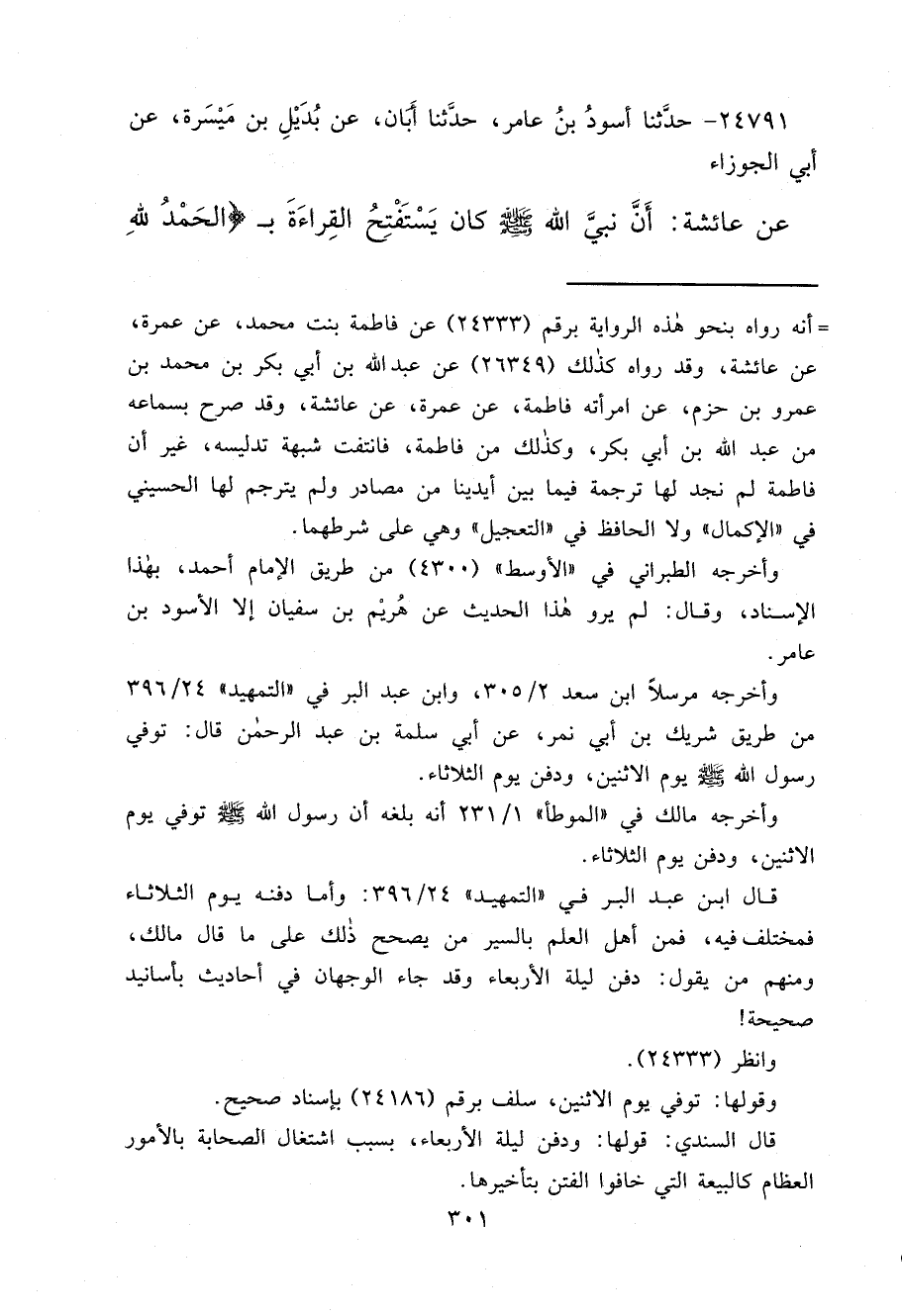 ٢٤٧٩١ - حَدَّثَنَا أَسْوَدُ بْنُ عَامِرٍ، حَدَّثَنَا أَبَانُ، عَنْ بُدَيْلِ بْنِ مَيْسَرَةَ، عَنْ أَبِي الْجَوْزَاءِ، عَنْ عَائِشَةَ، " أَنَّ نَبِيَّ اللهِ صَلَّى اللهُ عَلَيْهِ وَسَلَّمَ كَانَ يَسْتَفْتِحُ الْقِرَاءَةَ بِالْحَمْدُ لِلَّهِ
