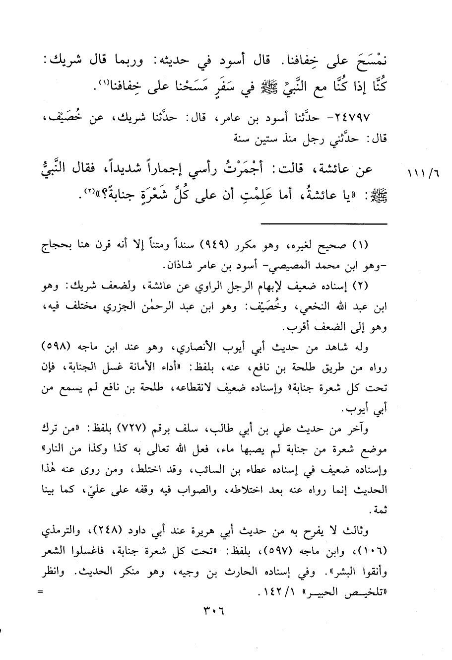 ٢٤٧٩٧ - حَدَّثَنَا أَسْوَدُ بْنُ عَامِرٍ، قَالَ: حَدَّثَنَا شَرِيكٌ، عَنْ خُصَيْفٍ، قَالَ: حَدَّثَنِي رَجُلٌ، مُنْذُ سِتِّينَ سَنَةً، عَنْ عَائِشَةَ، قَالَتْ: أَجْمَرْتُ رَأْسِي إِجْمَارًا شَدِيدًا، فَقَالَ النَّبِيُّ صَلَّى اللهُ عَلَيْهِ وَسَلَّمَ: " يَا عَائِشَةُ، أَمَا عَلِمْتِ أَنَّ عَلَى كُلِّ شَعَرَةٍ جَنَابَةً " (٢)