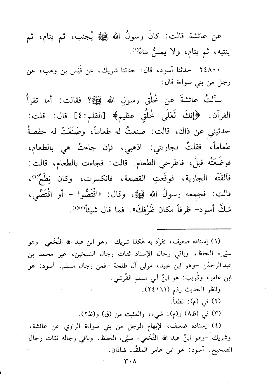 ٢٤٨٠٠ - حَدَّثَنَا أَسْوَدُ، قَالَ: حَدَّثَنَا شَرِيكٌ، عَنْ قَيْسِ بْنِ وَهْبٍ، عَنْ رَجُلٍ، مِنْ بَنِي سُوَاءَةَ، قَالَ: سَأَلْتُ عَائِشَةَ عَنْ خُلُقِ رَسُولِ اللهِ صَلَّى اللهُ عَلَيْهِ وَسَلَّمَ، فَقَالَتْ: أَمَا تَقْرَأُ الْقُرْآنَ {إِنَّكَ لَعَلَى خُلُقٍ عَظِيمٍ} [القلم: ٤] ؟ قَالَ: قُلْتُ: حَدِّثِينِي عَنْ ذَاكَ، قَالَتْ: صَنَعْتُ لَهُ طَعَامًا، وَصَنَعَتْ لَهُ حَفْصَةُ طَعَامًا، فَقُلْتُ لِجَارِيَتِي: اذْهَبِي، فَإِنْ جَاءَتْ هِيَ بِالطَّعَامِ، فَوَضَعَتْهُ قَبْلُ، فَاطْرَحِي الطَّعَامَ، قَالَتْ: فَجَاءَتْ بِالطَّعَامِ، قَالَتْ: فَأَلْقَتْهُ الْجَارِيَةُ، فَوَقَعَتِ الْقَصْعَةُ، فَانْكَسَرَتْ، وَكَانَ نِطْعٌ (٢) ، قَالَتْ: فَجَمَعَهُ رَسُولُ اللهِ صَلَّى اللهُ عَلَيْهِ وَسَلَّمَ، وَقَالَ: " اقْتَصُّوا، أَوْ اقْتَصِّي، شَكَّ أَسْوَدُ، ظَرْفًا مَكَانَ ظَرْفِكِ"، فَمَا قَالَ شَيْئًا (٣) (٤)