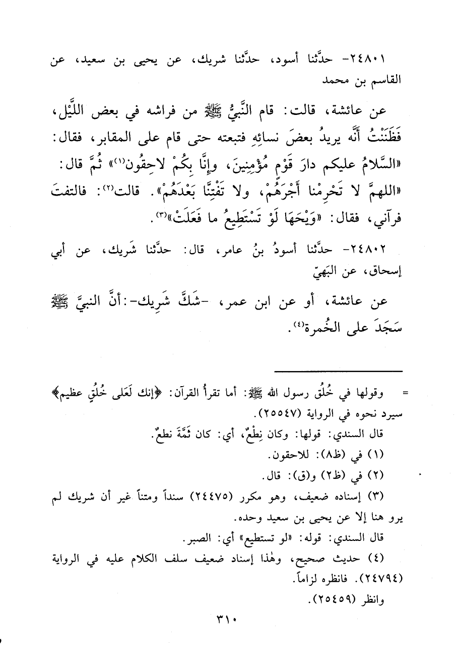 ٢٤٨٠١ - حَدَّثَنَا أَسْوَدُ، حَدَّثَنَا شَرِيكٌ، عَنْ يَحْيَى بْنِ سَعِيدٍ، عَنْ الْقَاسِمِ بْنِ مُحَمَّدٍ، عَنْ عَائِشَةَ، قَالَتْ: قَامَ النَّبِيُّ صَلَّى اللهُ عَلَيْهِ وَسَلَّمَ مِنْ فِرَاشِهِ فِي بَعْضِ اللَّيْلِ، فَظَنَنْتُ أَنَّهُ يُرِيدُ بَعْضَ نِسَائِهِ، فَتَبِعْتُهُ حَتَّى قَامَ عَلَى الْمَقَابِرِ، فَقَالَ: " السَّلَامُ عَلَيْكُمْ دَارَ قَوْمٍ مُؤْمِنِينَ، وَإِنَّا بِكُمْ لَاحِقُونَ (١) "، ثُمَّ قَالَ: " اللهُمَّ لَا تَحْرِمْنَا أَجْرَهُمْ، وَلَا تَفْتِنَّا بَعْدَهُمْ "، قَالَتْ (٢) : فَالْتَفَتَ فَرَآنِي، فَقَالَ: " وَيْحَهَا لَوْ تَسْتَطِيعُ مَا فَعَلَتْ " (٣)