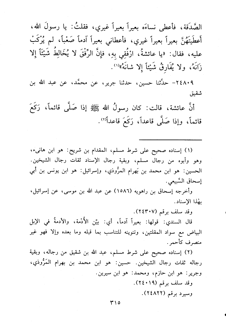٢٤٨٠٩ - حَدَّثَنَا حُسَيْنٌ، حَدَّثَنَا جَرِيرٌ، عَنْ مُحَمَّدٍ، عَنْ عَبْدِ اللهِ بْنِ شَقِيقٍ، أَنَّ عَائِشَةَ، قَالَتْ: " كَانَ رَسُولُ اللهِ صَلَّى اللهُ عَلَيْهِ وَسَلَّمَ إِذَا صَلَّى قَائِمًا رَكَعَ قَائِمًا، وَإِذَا صَلَّى قَاعِدًا رَكَعَ قَاعِدًا " (٢)